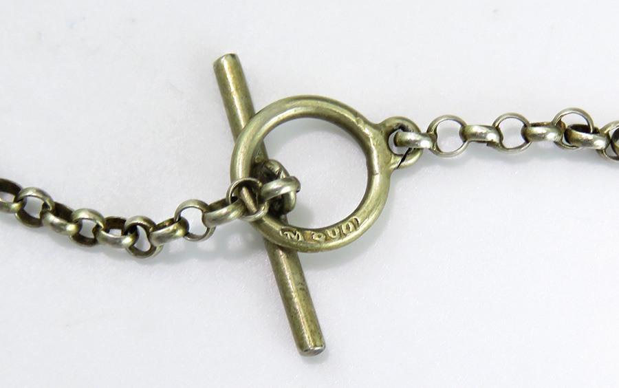 The clasp is stamped 800 for the purity of the silver, with another mark that looks like M right before it. There are no other marks we can find, but we have tested the piece and guarantee all parts to be at least 800 purity silver.