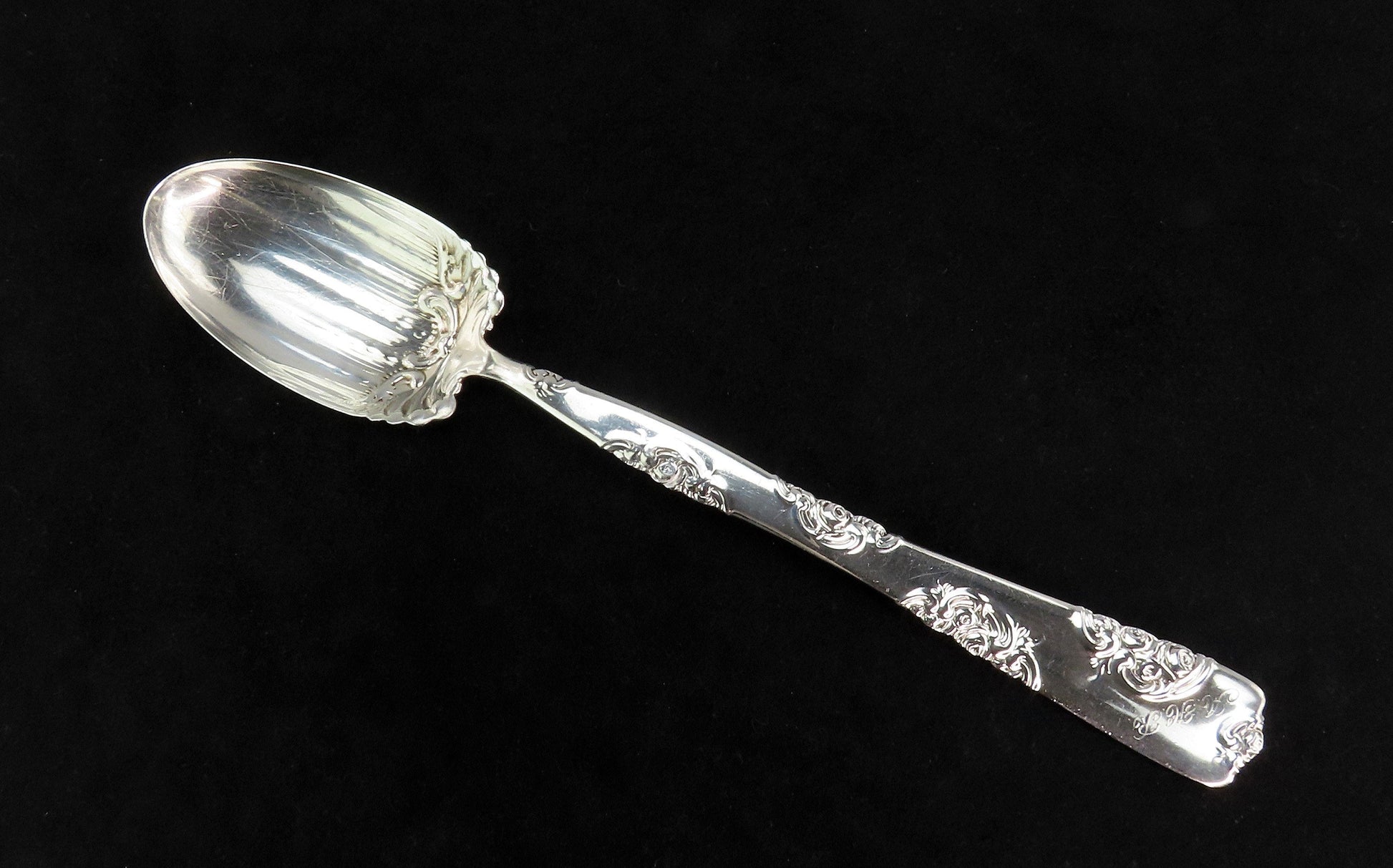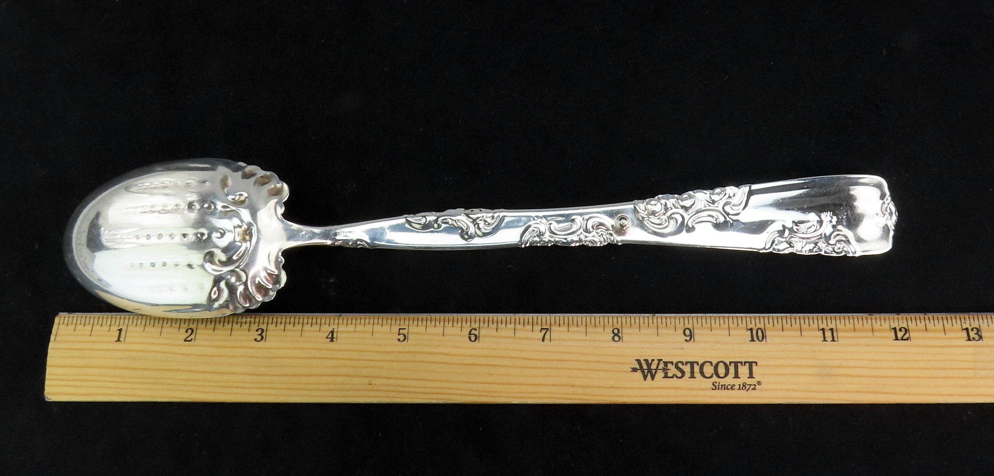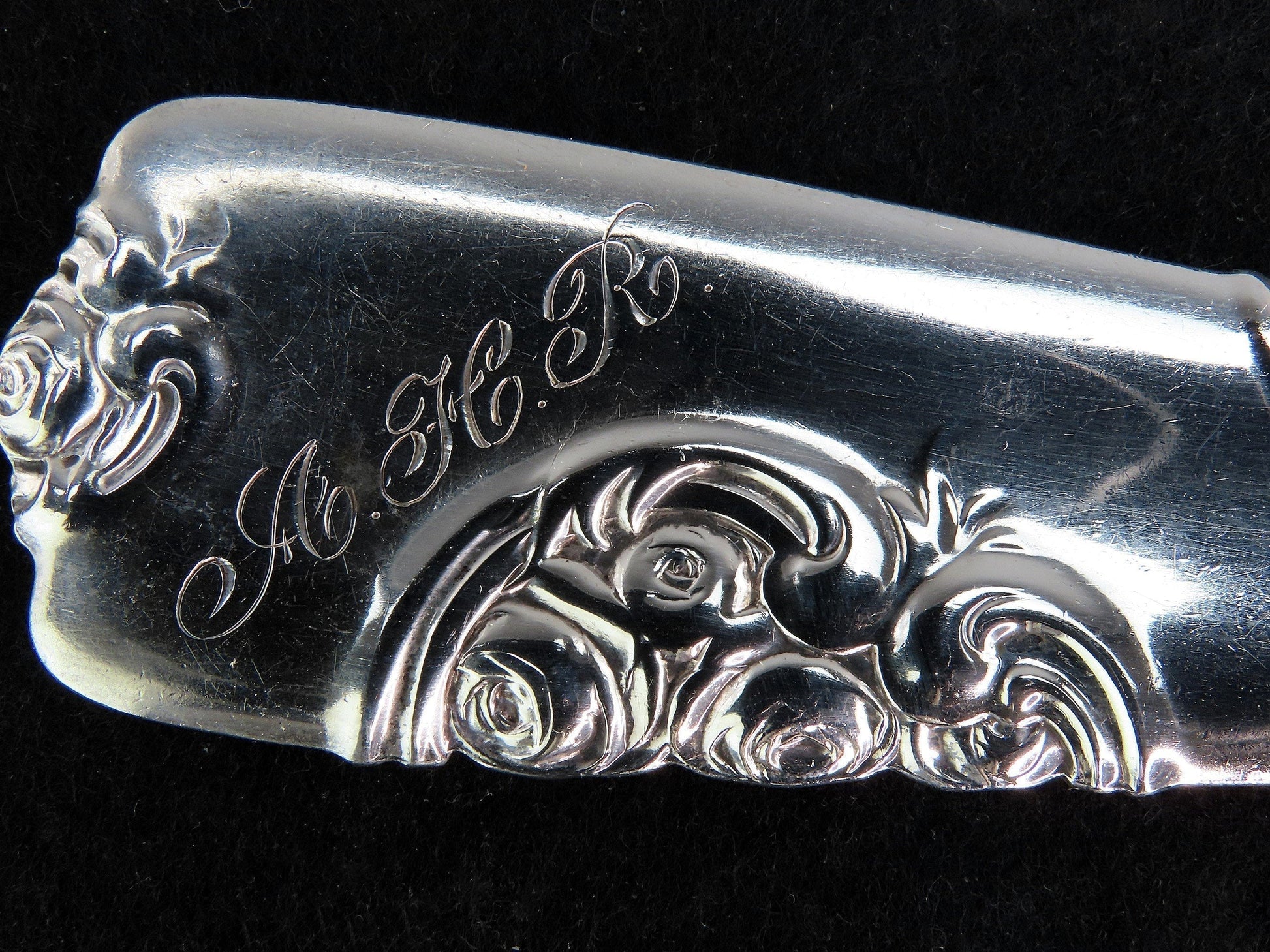 c1880s Whiting Sterling Silver Roses and Scrolls Serving Platter Stuffing Spoon