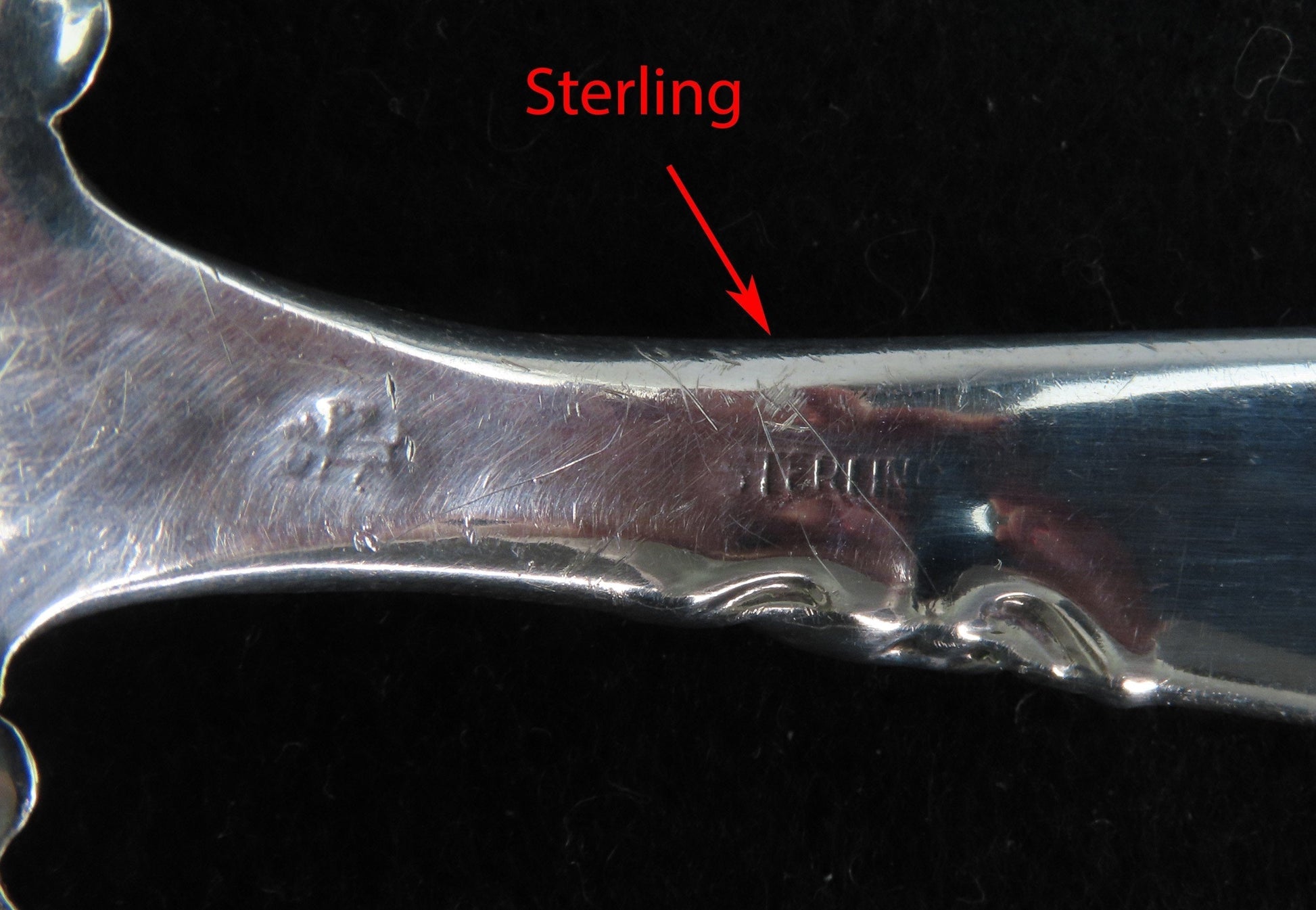 This piece is stamped sterling as well as the maker's mark for Whiting Co, though the marks are a little worn. The spoon is in overall excellent condition, but some minor scratches are present in the bowl.