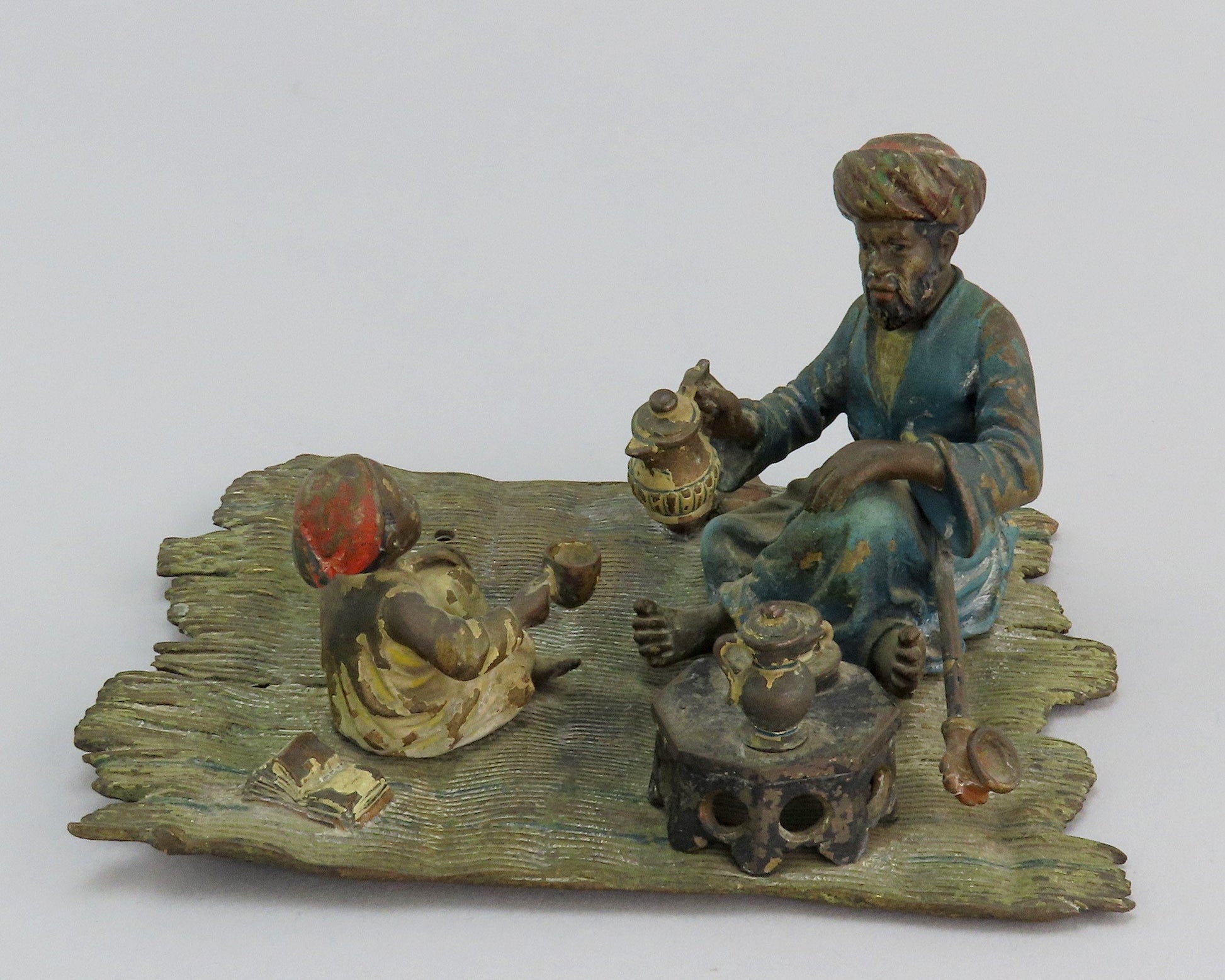 Presented is an interesting Austrian bronze scene likely produced in the 1880s-1910s. This piece displays a Middle Eastern scene of a man serving tea to a young boy with a small table and items scattered throughout the ground. They are sitting on a carpet. The man, table, and boy are secured to the base with screws.