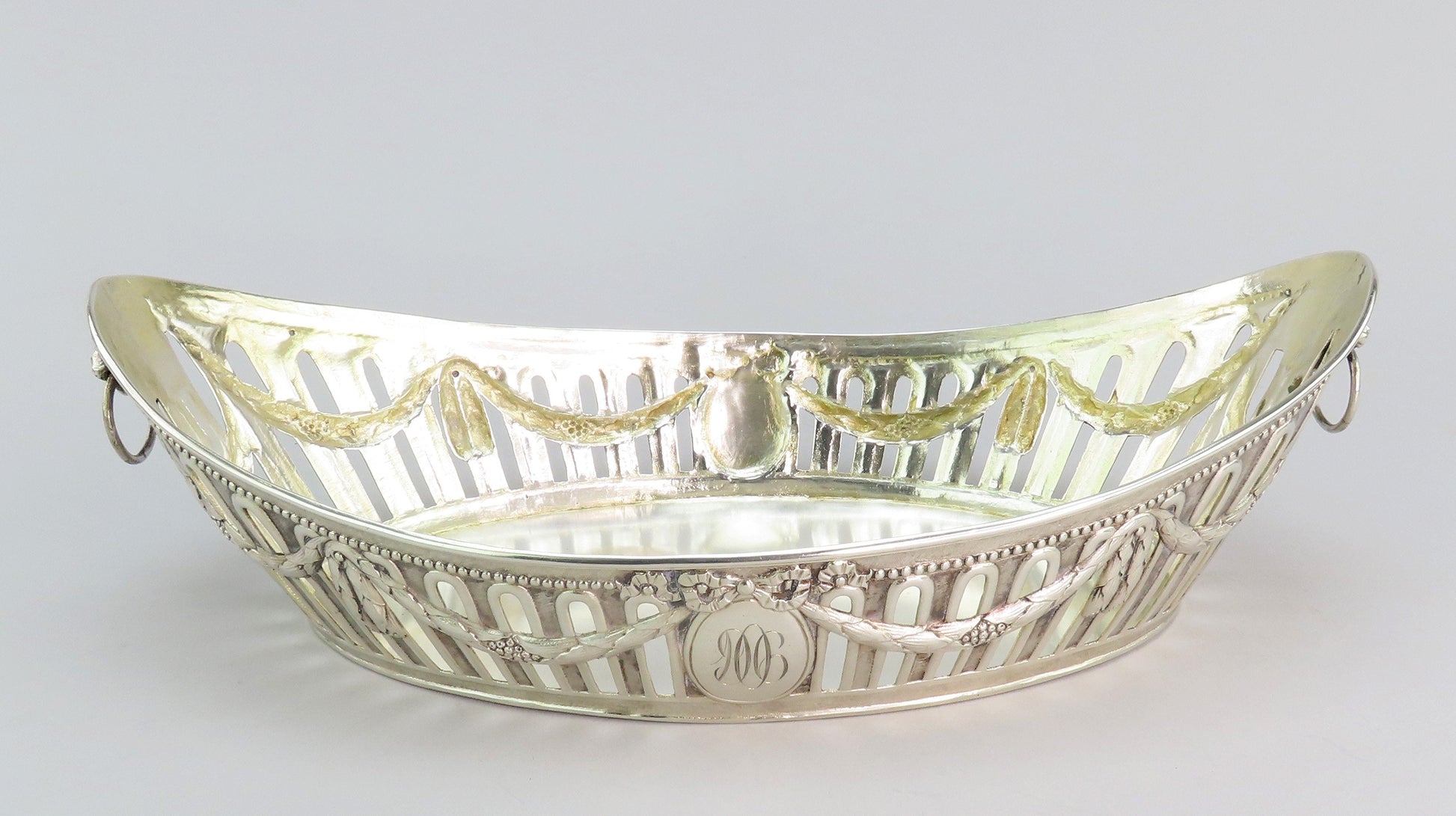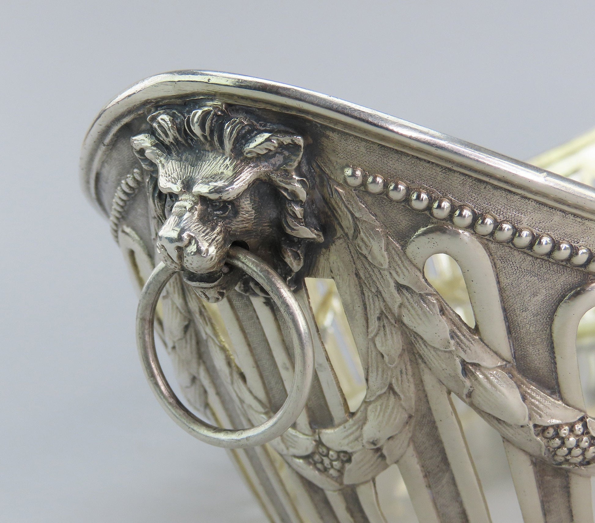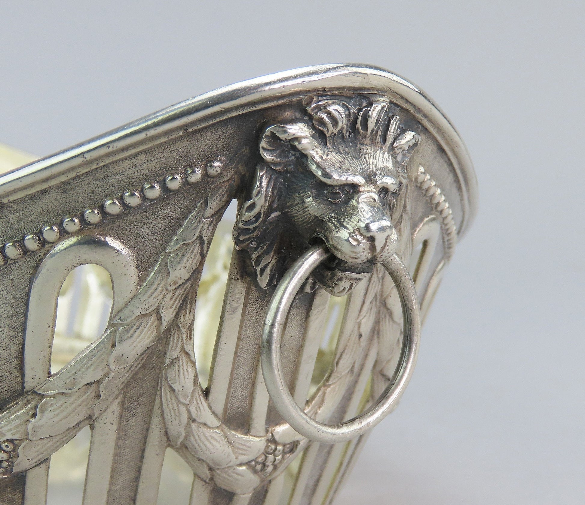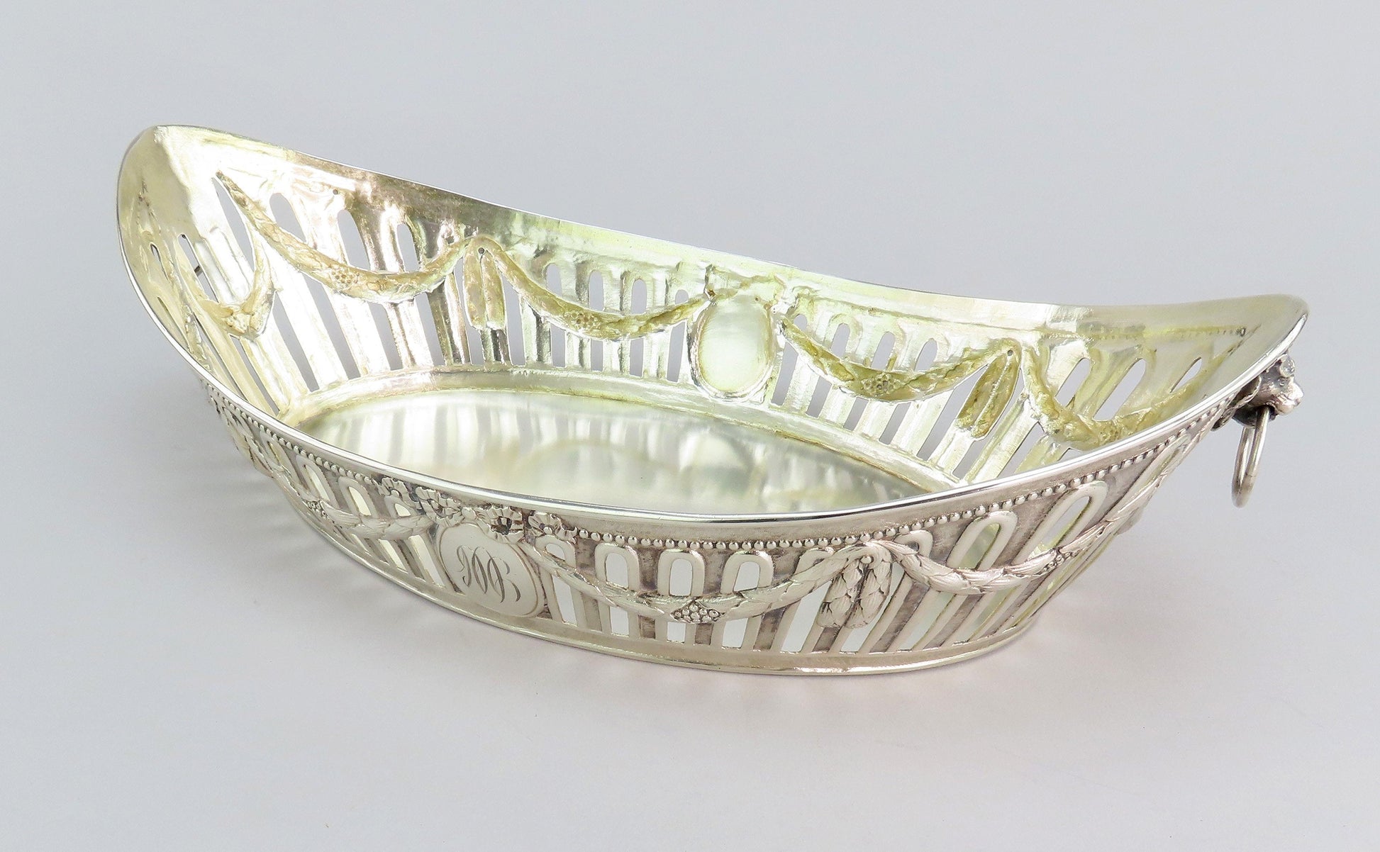 Presented is an elegant German silver bread or fruit basket bowl from the late 1800s- early 1900s. This piece displays a classical garland decoration around the bowl with bows and a beaded edge. Each end has a high relief cast lion with a ring in the mouth. On either long side there is a cartouche that has been monogrammed on one side with “1906” and “ESP” on the other. The interior has a soft gold wash.