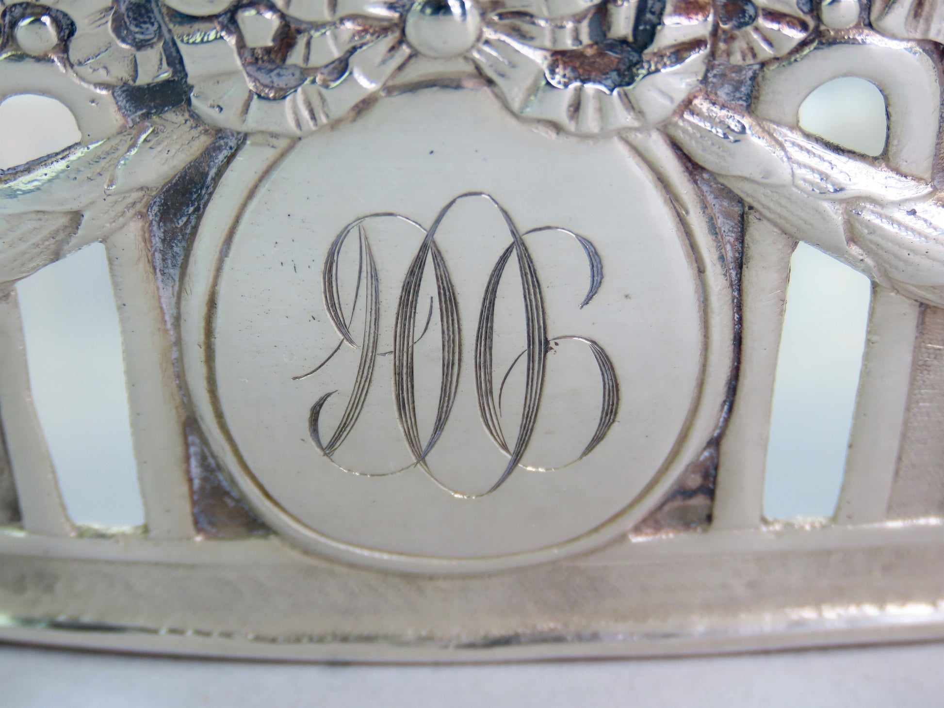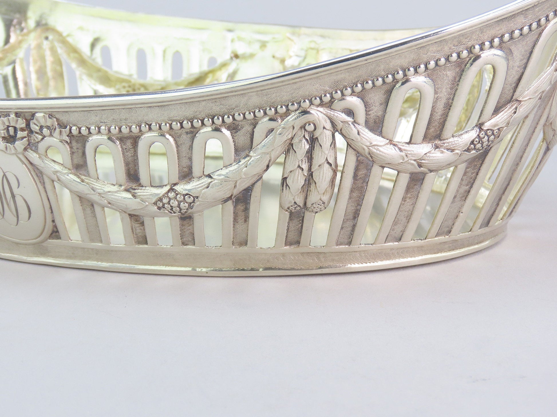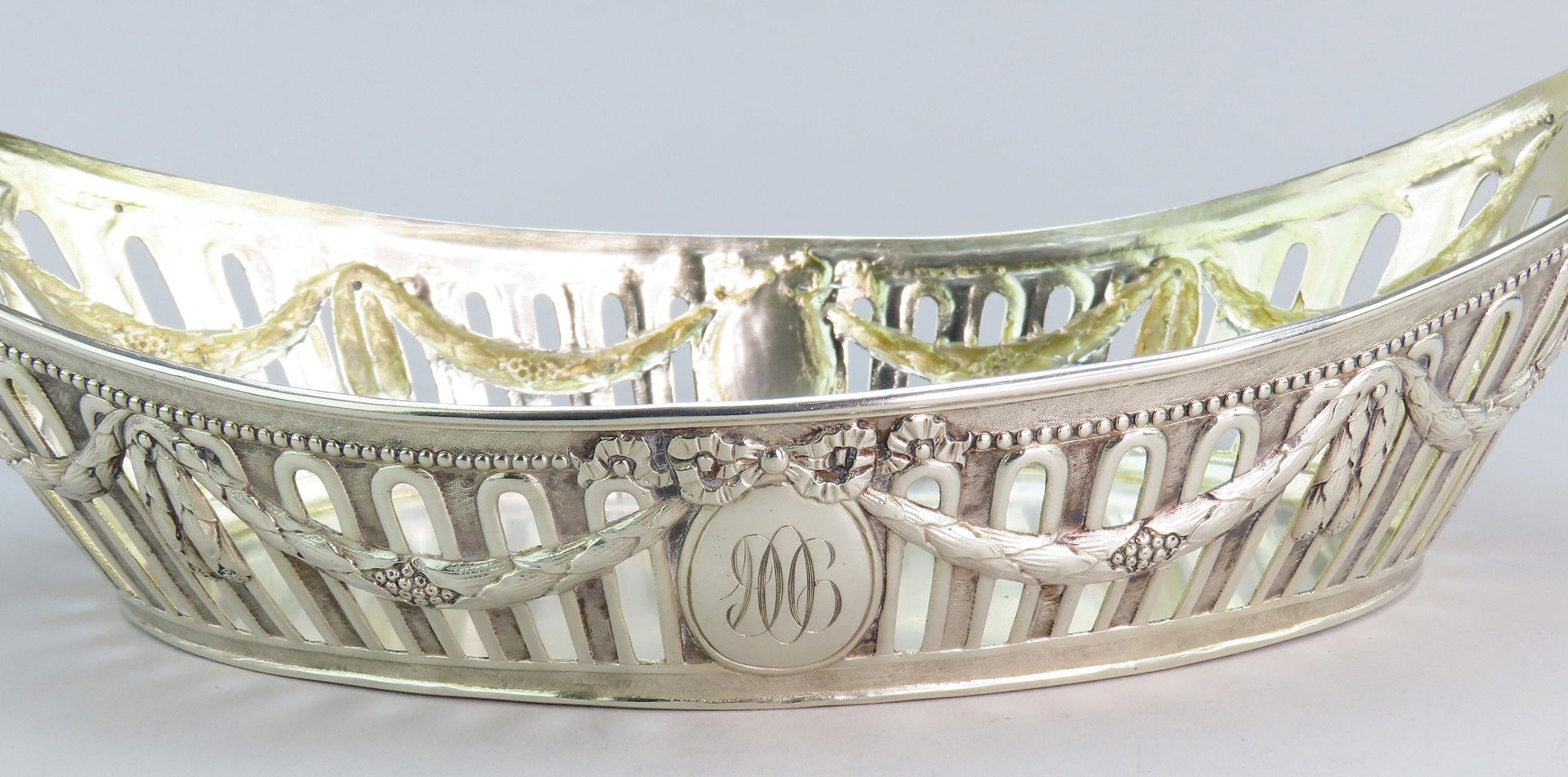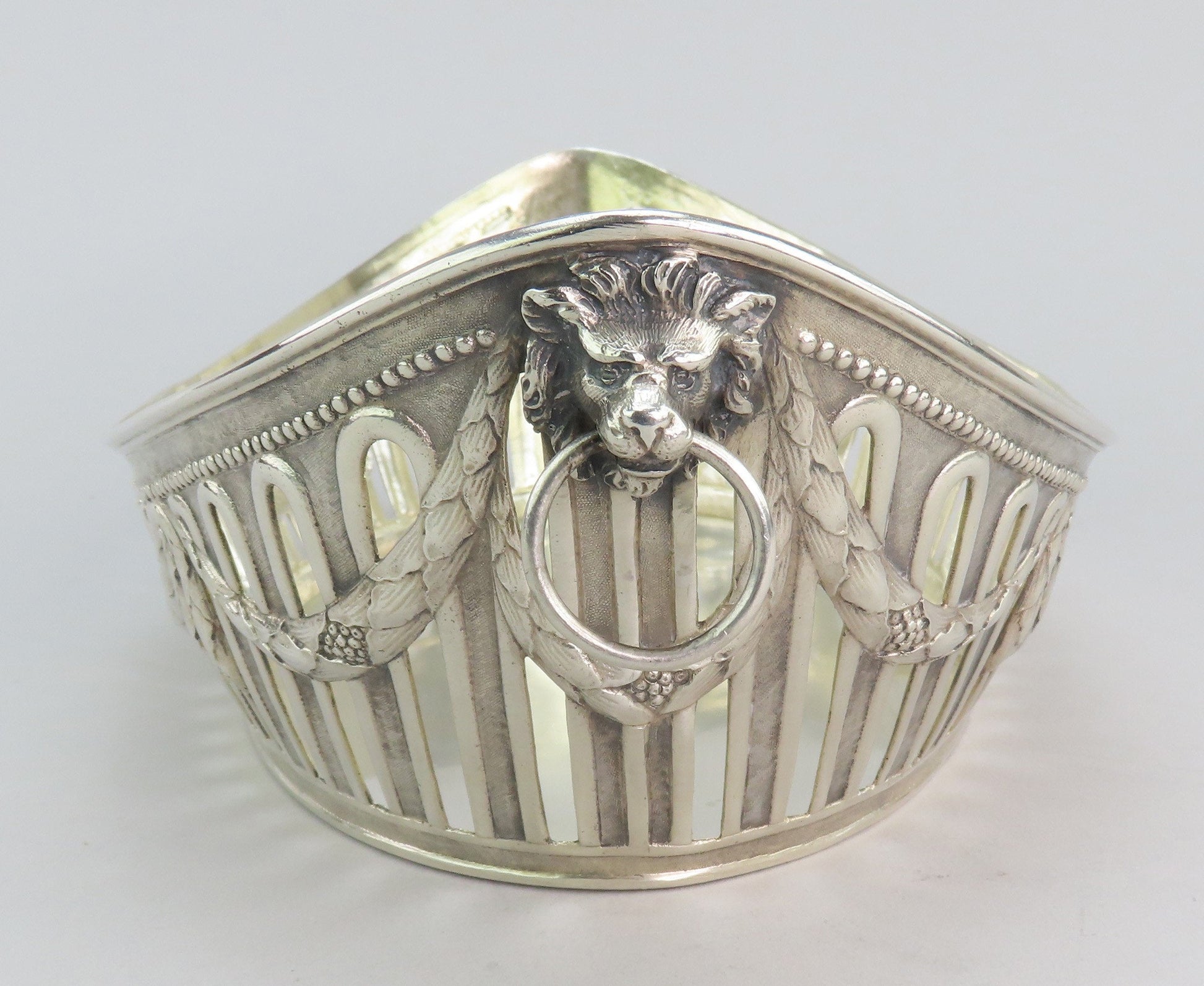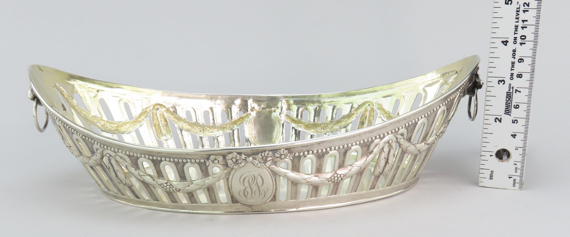 Presented is an elegant German silver bread or fruit basket bowl from the late 1800s- early 1900s. This piece displays a classical garland decoration around the bowl with bows and a beaded edge. Each end has a high relief cast lion with a ring in the mouth. On either long side there is a cartouche that has been monogrammed on one side with “1906” and “ESP” on the other. The interior has a soft gold wash.