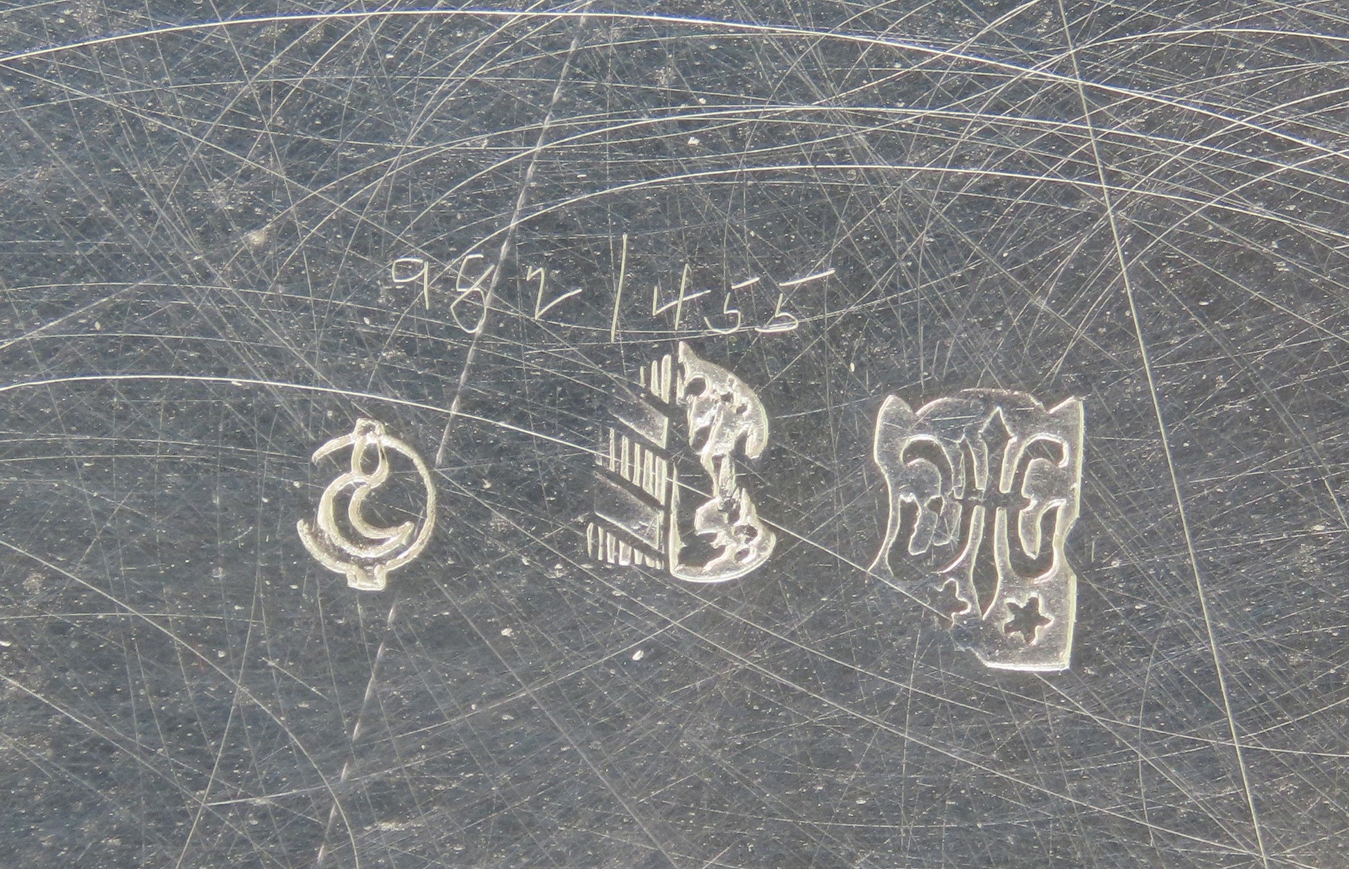 The piece is at least .800 purity silver, tested and guaranteed. There are three hallmarks on the underside of the piece.