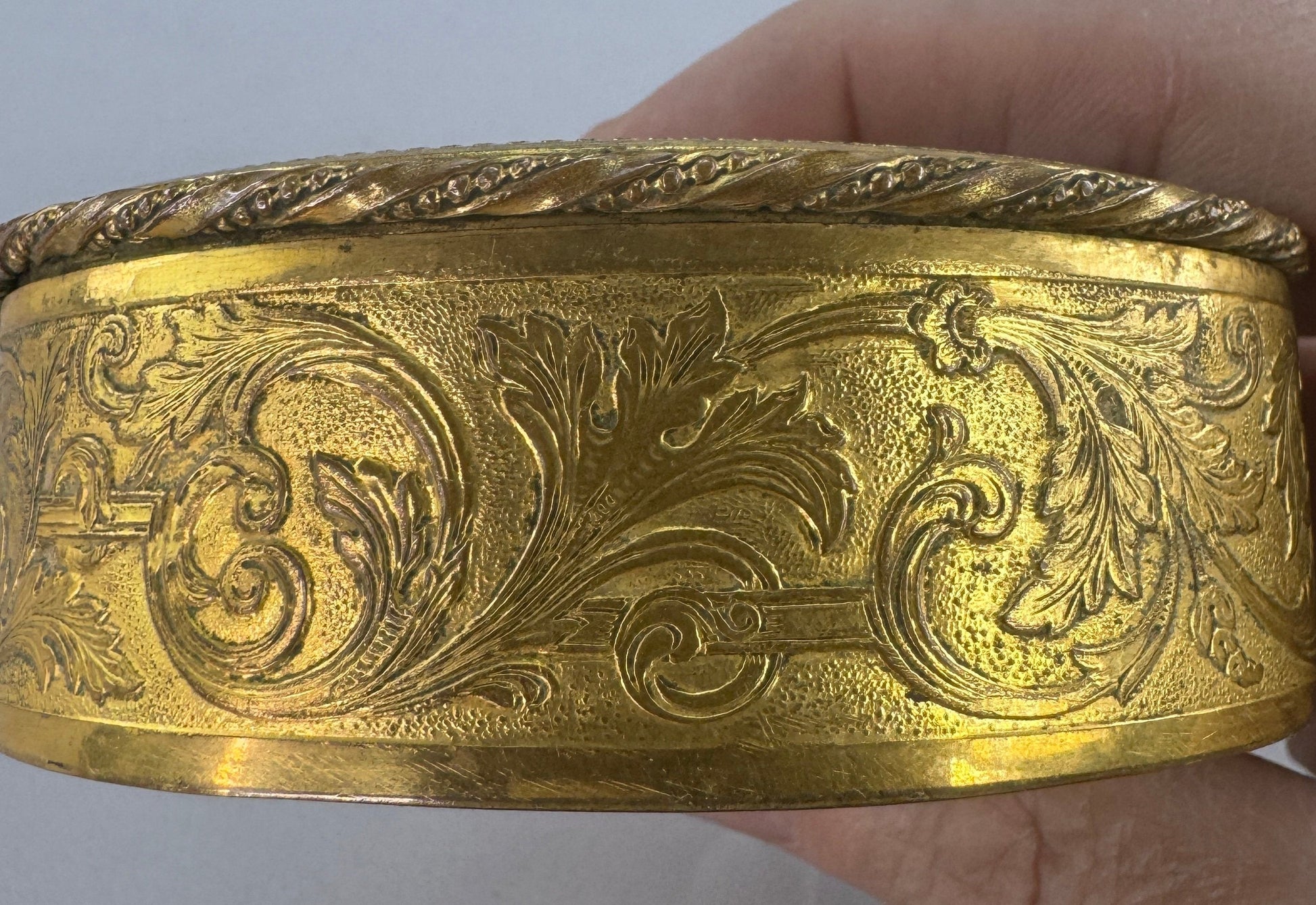 Presented is a superb quality gilt bronze trinket or sewing notion box set with a miniature portrait in the lid, dating to circa 1880-1910. The box is likely French or otherwise continental European, and the painting is signed at about the 6 o'clock position with Graf or Grof. The portrait is beautifully hand painted, depicting a young woman in a purple off the shoulder garment and gypsy-style hair wrap, with long flowing brown hair, against a vibrant red background. The gilt bronze body of the box is very ornately decorated as well, with ropetwist edging around the lid and a continuous border of fanciful acanthus scrollwork decoration around the sides. The interior is lined with fabric which is likely original. The hinges are particularly well made, designed in a way that the lid can't be over-extended when opened.
