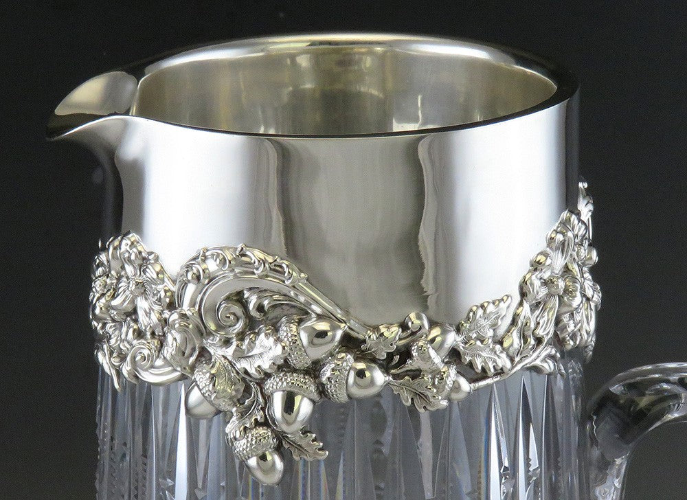 Presented is a tall, heavy brilliant cut glass and sterling silver ewer or water pitcher produced by Redlich & Company of New York city near the end of the 19th century, about 1896. The detailing in the silver decorated with acorns, flowers, foliage and scrolls is exquisitely done, and the silver is generously applied! The thick glass is cut in vertical prisms edged in zippers and ovals, and the handle is cut in boldly scaled rounds and cross-checks. There's a fabulous hobstar in the base with 24 rays.
