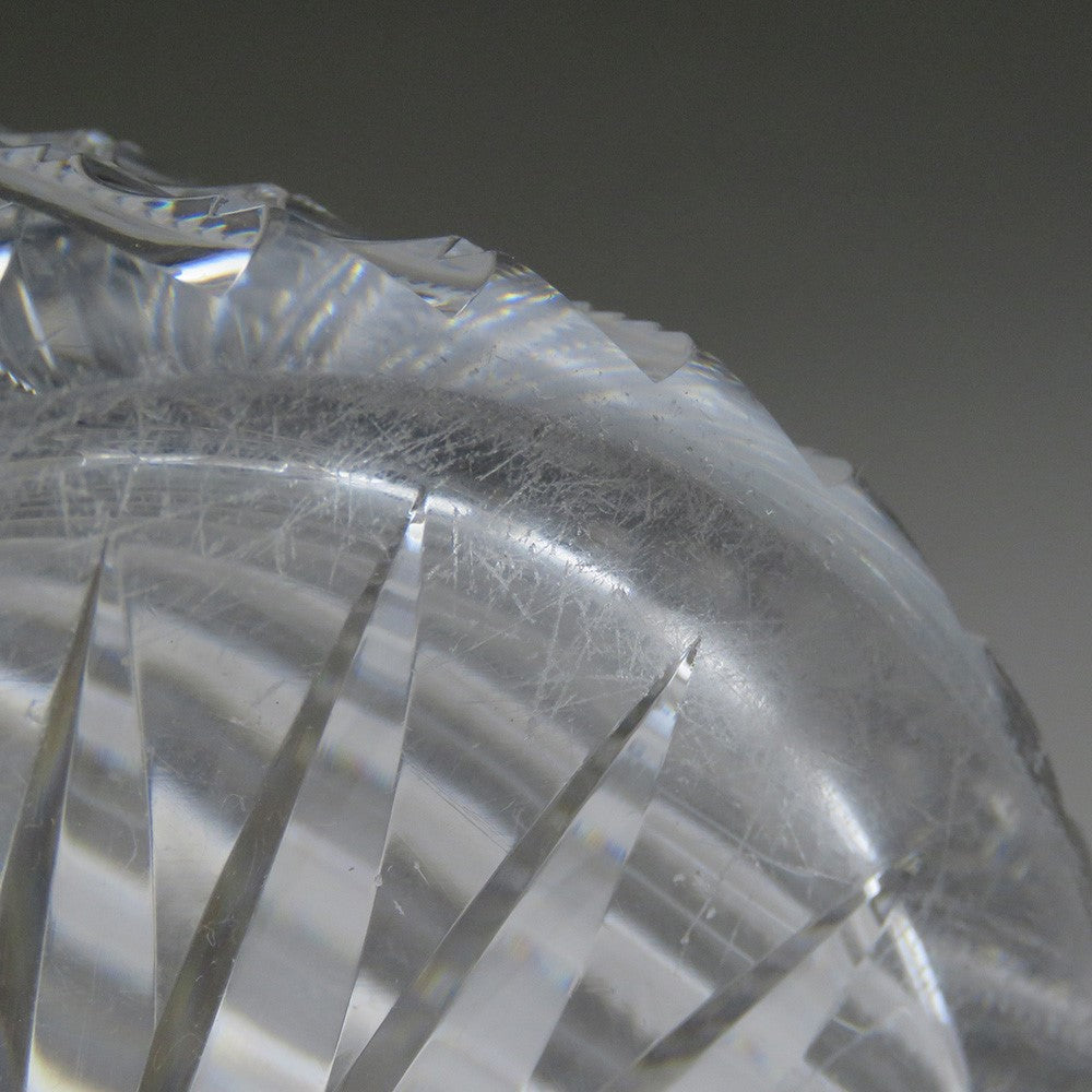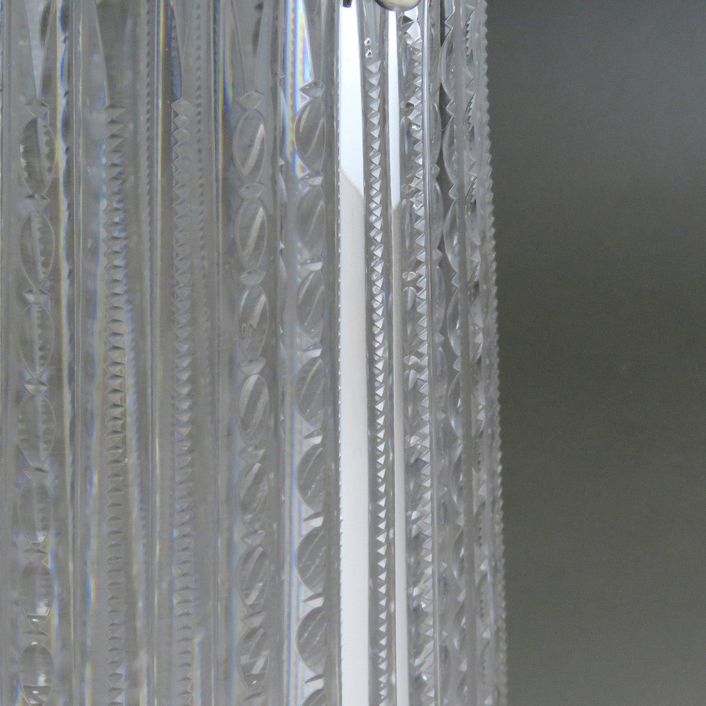 The sterling silver top is hallmarked with the Redlich & Co. maker's mark, "Sterling", "Pat 96" and the number 146. The glass bears no signatures that we can find, but given the high level of craftsmanship required to produce this piece, the cut glass is assumed to be the work of Dorflinger or Mauser or Hawkes, the master glass cutters of the period.