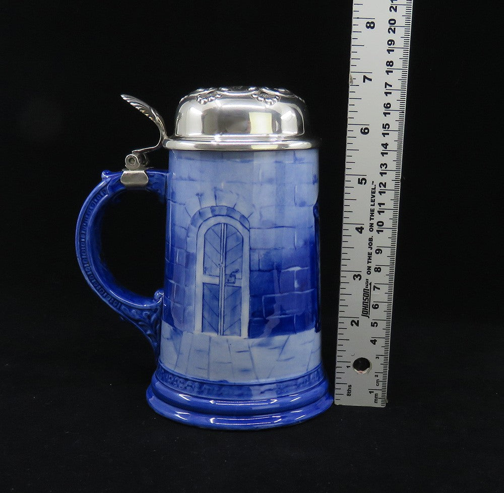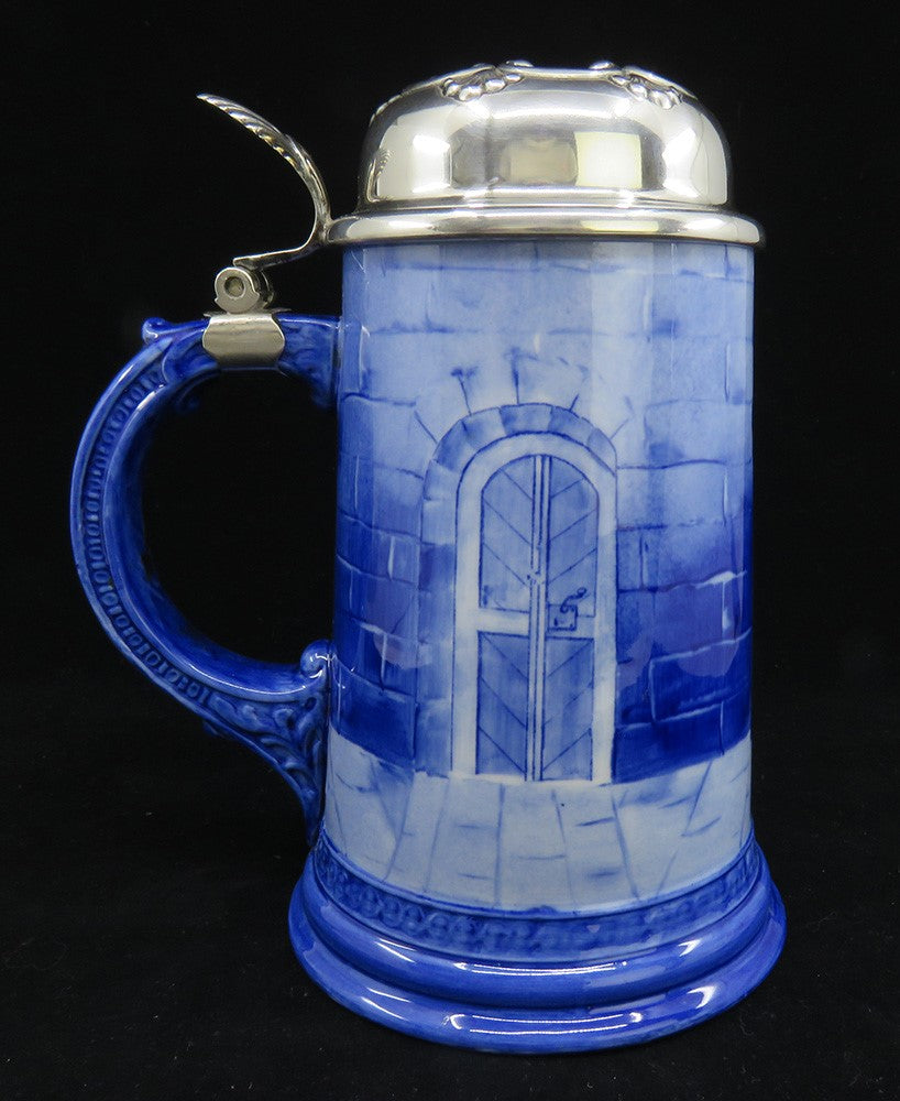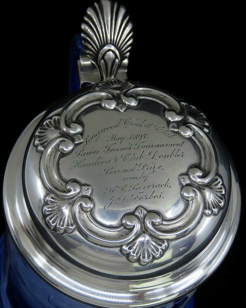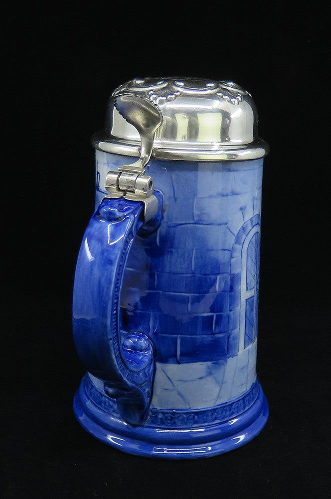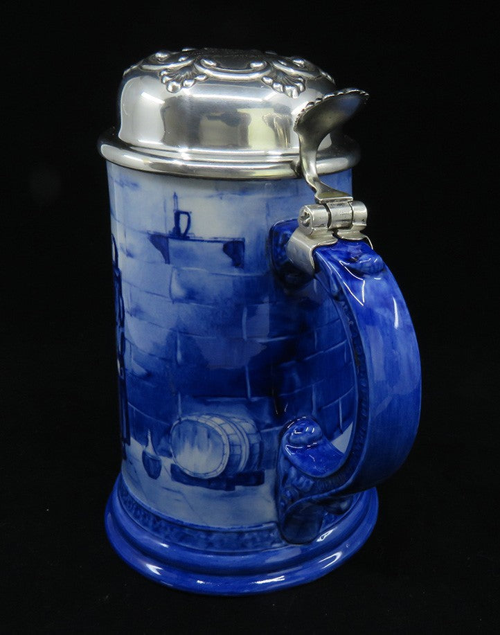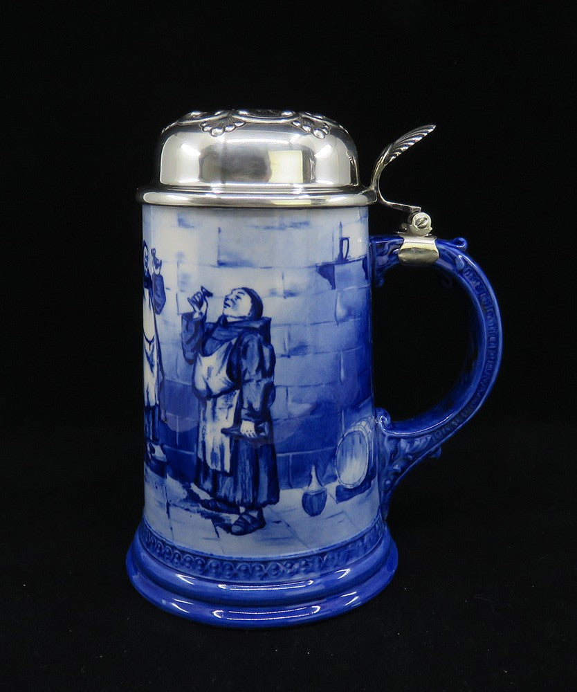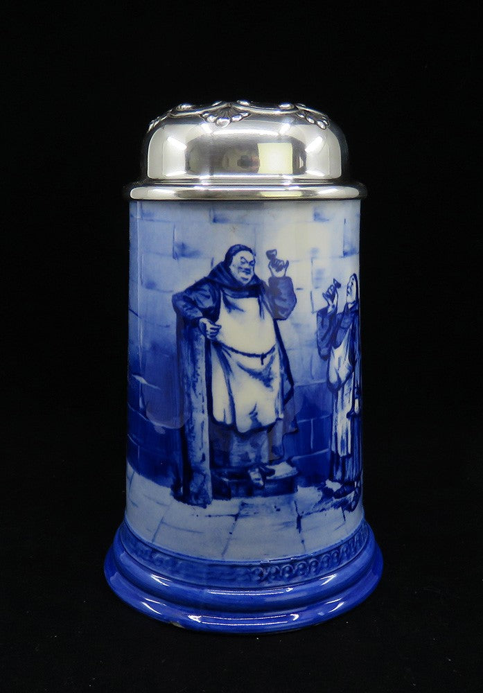 Presented is a charming antique American ceramic beer stein with sterling silver lid, dating to circa 1897. This stein features a charming scene around the sides in blue and white, depicting two monks joyfully sampling liquor, against a background of the monastery's brick walls and arched doorways, in the style of German painter Eduard von Grützner. The lid is done in sterling silver, finely hand chased with classic shell and scroll decoration, with a bold shell form thumbpiece. The top of the lid has a presentation reading “Longwood Cricket Club May 1897 Lawn Tennis Tournament Handicap Club Doubles Second Prize won by H. C. Laverack, J. D. Forbes.” This stein has a capacity of half a liter (500 milliliters/16.9 fluid ounces).