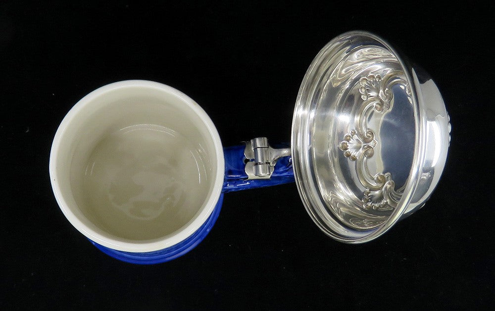 This piece is in excellent overall condition. There is a single tiny chip around the edge of the foot, which is hard to notice without turning the stein over to inspect it. There are no other chips, no cracks, no breaks, and no repairs. The sterling silver lid is in great shape, with no splits, no dents, no monogram removals, and no repairs.