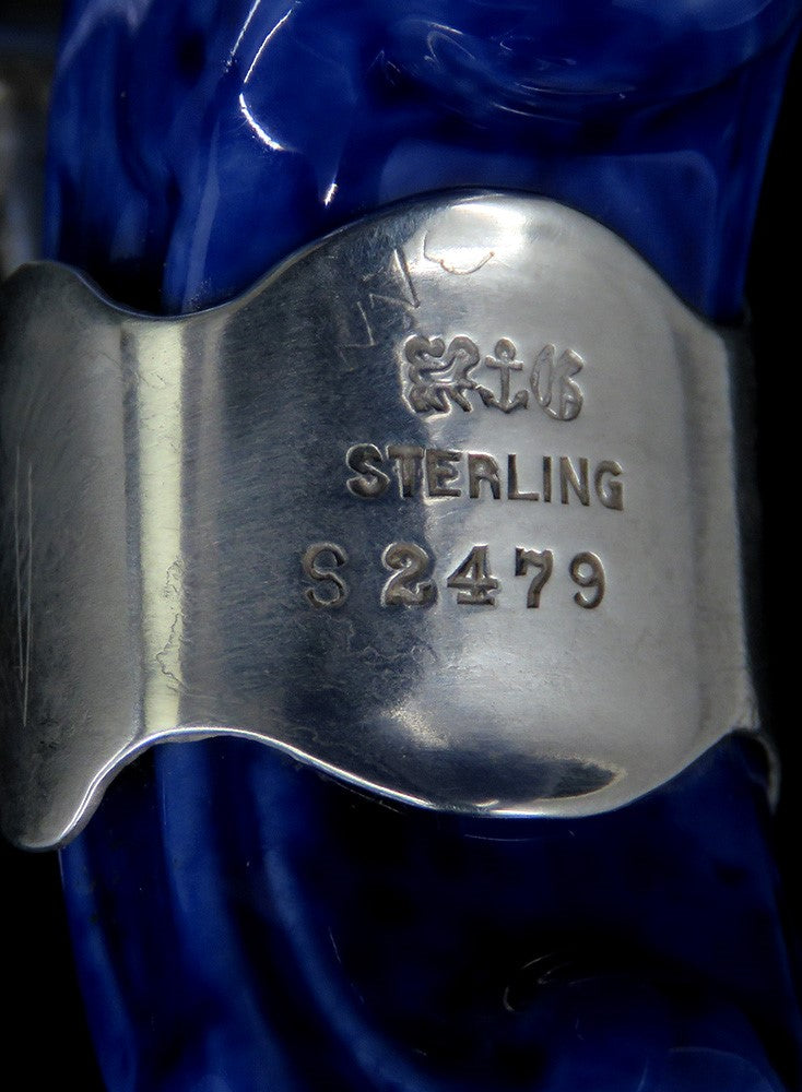 The underside of the stein is signed with the maker's mark for the Ceramic Arts Company, a renowned American art pottery company operating in Trenton, New Jersey. The sterling silver lid/thumbpiece are stamped with the maker's mark for Gorham as well as sterling and product number, S2479. This mark is on the underside of where the thumbpiece is mounted to the handle.
