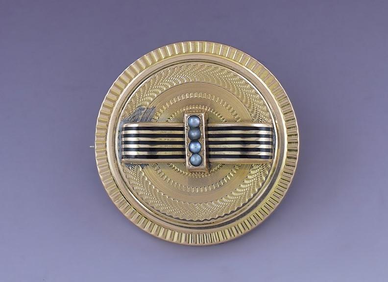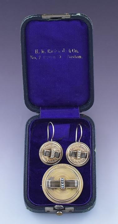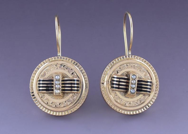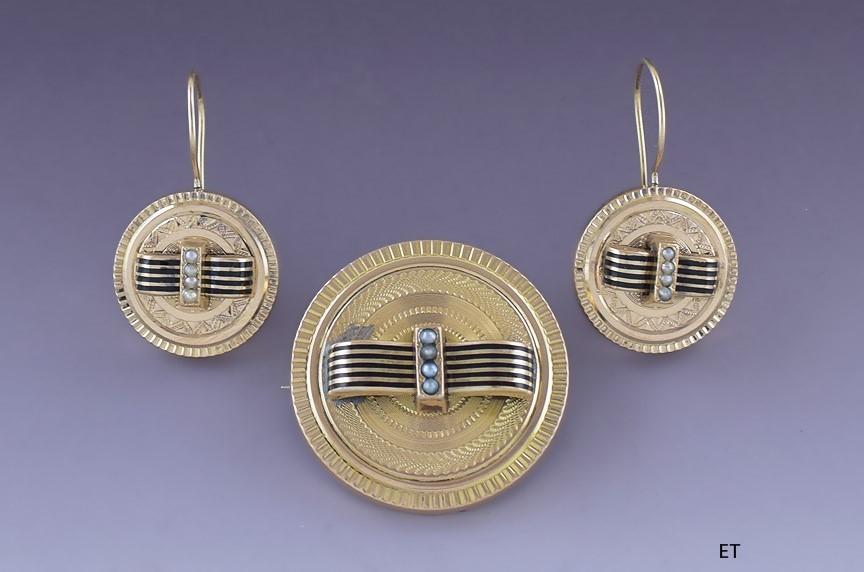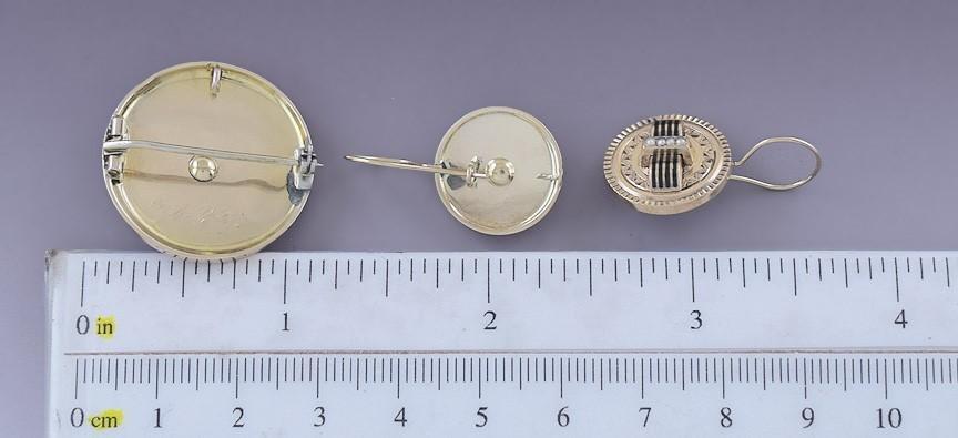 c1900 14K Gold Enamel Pearl Machine Turned Engraved Earrings & Pin Set