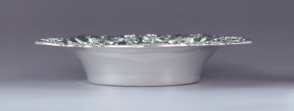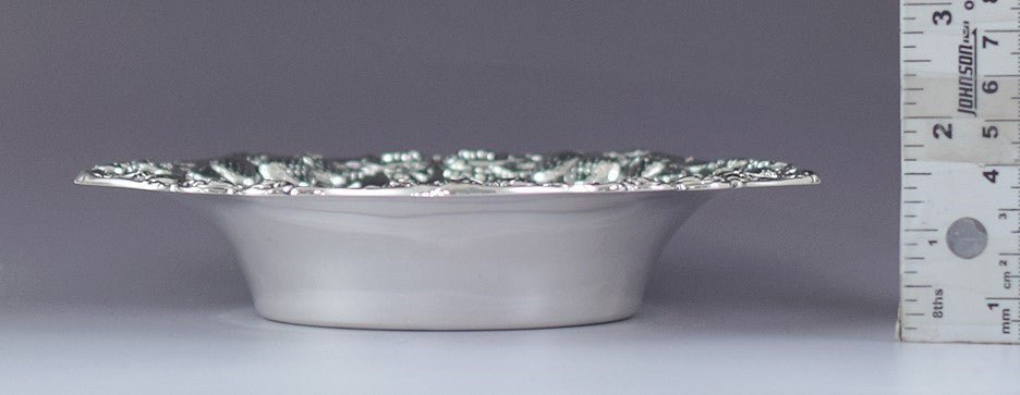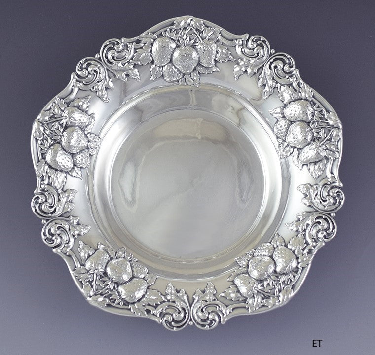Presented is a beautiful sterling silver bowl, made by the Woodside Sterling company. This piece dates to the late 1800s or early 1900s. The bowl has an applied border around the rim, featuring large clusters of strawberries surrounded by foliate scrollwork. The decoration is done in nicely detailed high relief, making this a very striking piece.