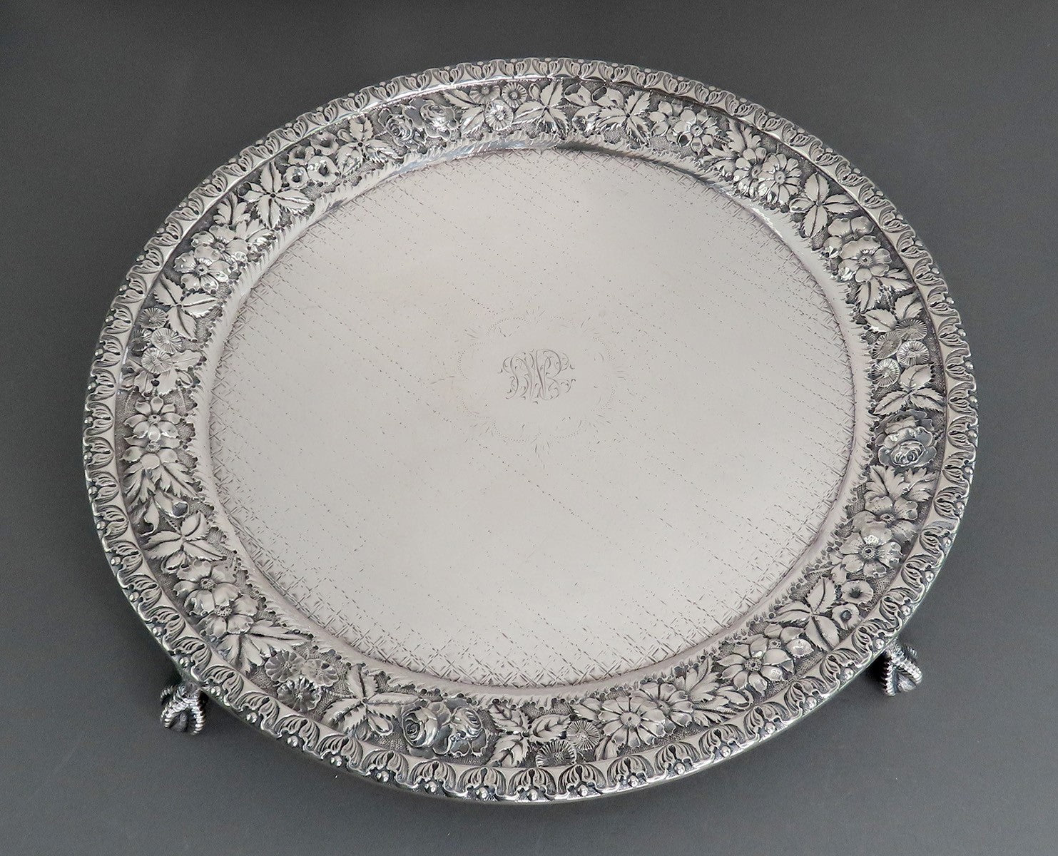 c1900 Baltimore Repousse Sterling Silver Round Tray Salver Ball Claw Feet