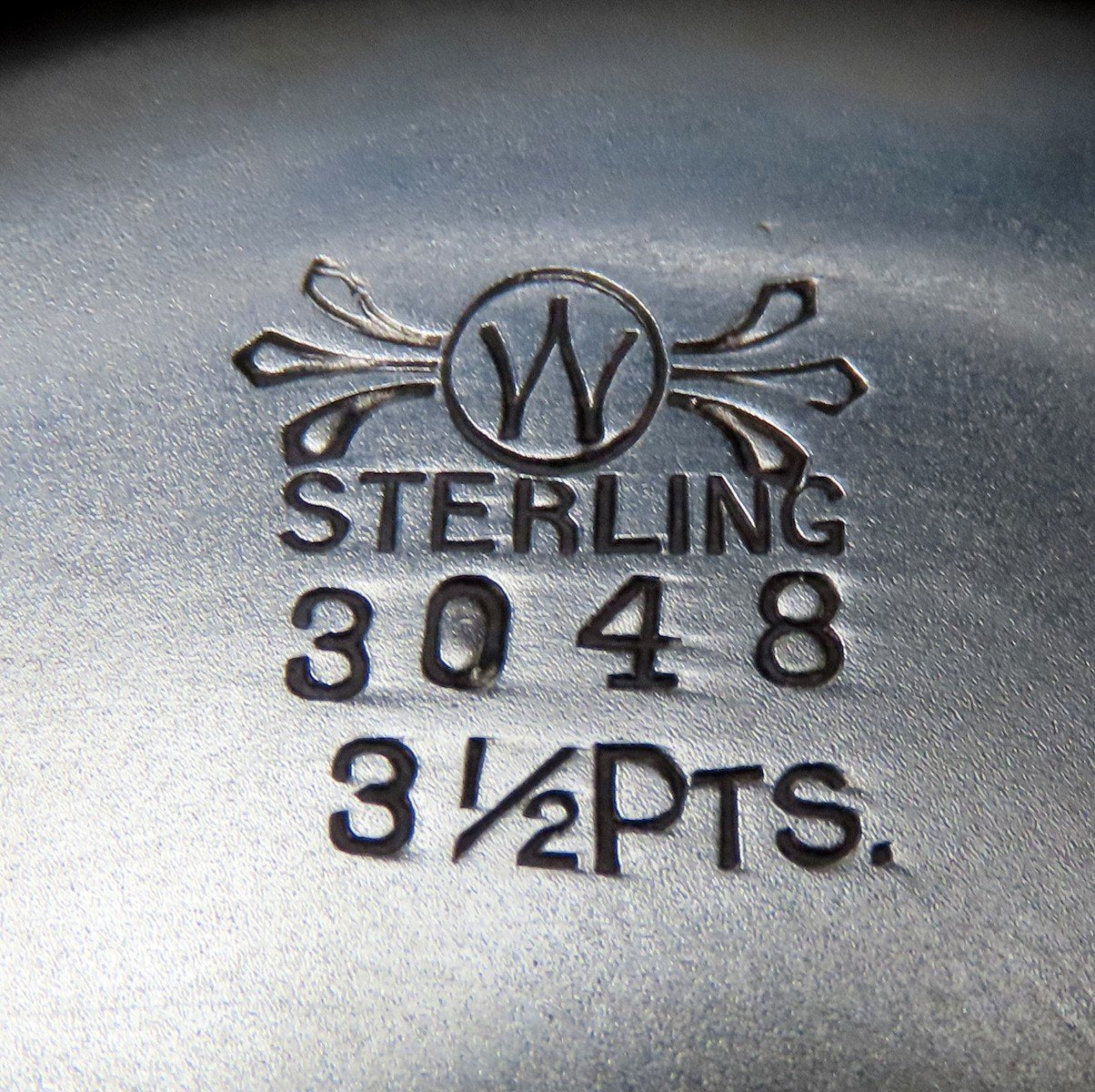 The underside is stamped with the maker's mark for Frank Whiting, as well as sterling, the number 3048, and the capacity, 3 1/2 pints.