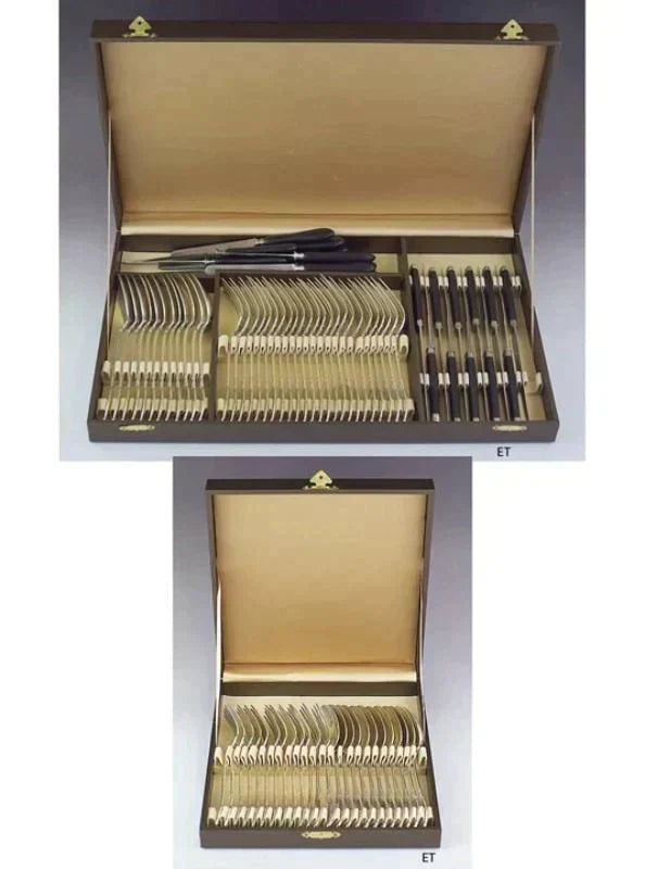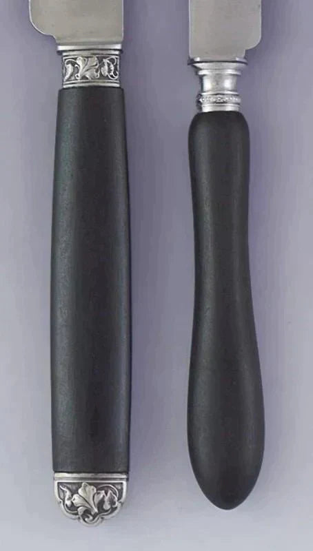 Presented is a fantastic quality French silver 83 piece flatware set. The set was made by Victor Boivin and dates to around the turn of the century. The set is done in a lovely Art Nouveau style, with sinuous, flowing ribbonlike designs and realistic honeysuckle or other trumpet type flowers adorning the handles. The knives have beautiful rich ebony handles. The larger knives have stainless steel knives in the New French form, while the smaller knives have carbon steel blades in the Old Blunt form. Each non-knife piece has a monogram of BT in overlapping letters.