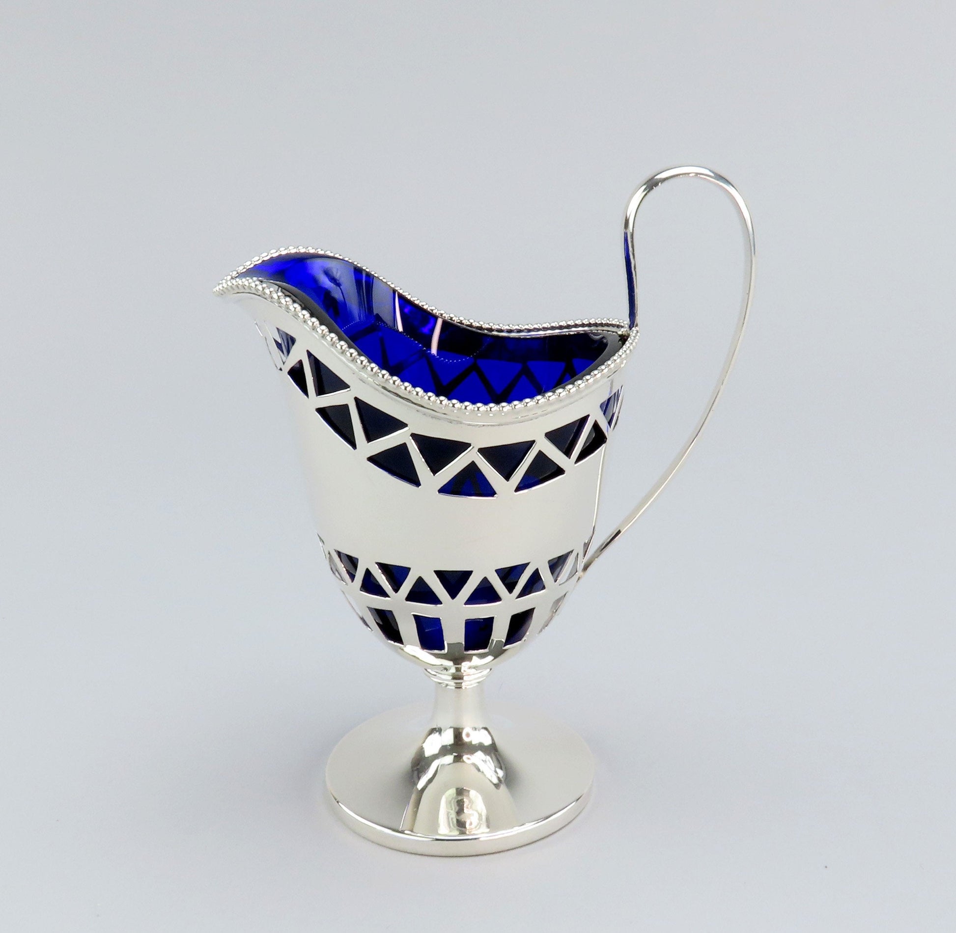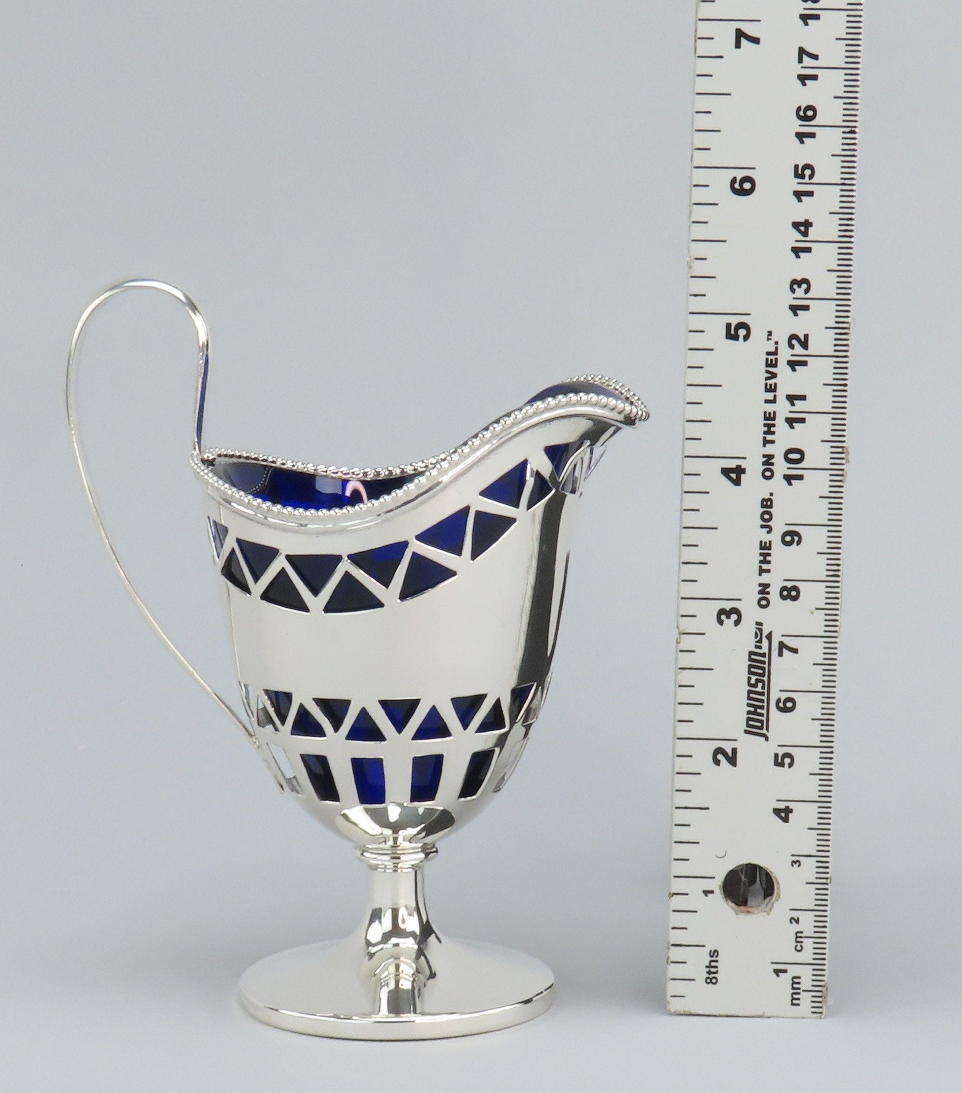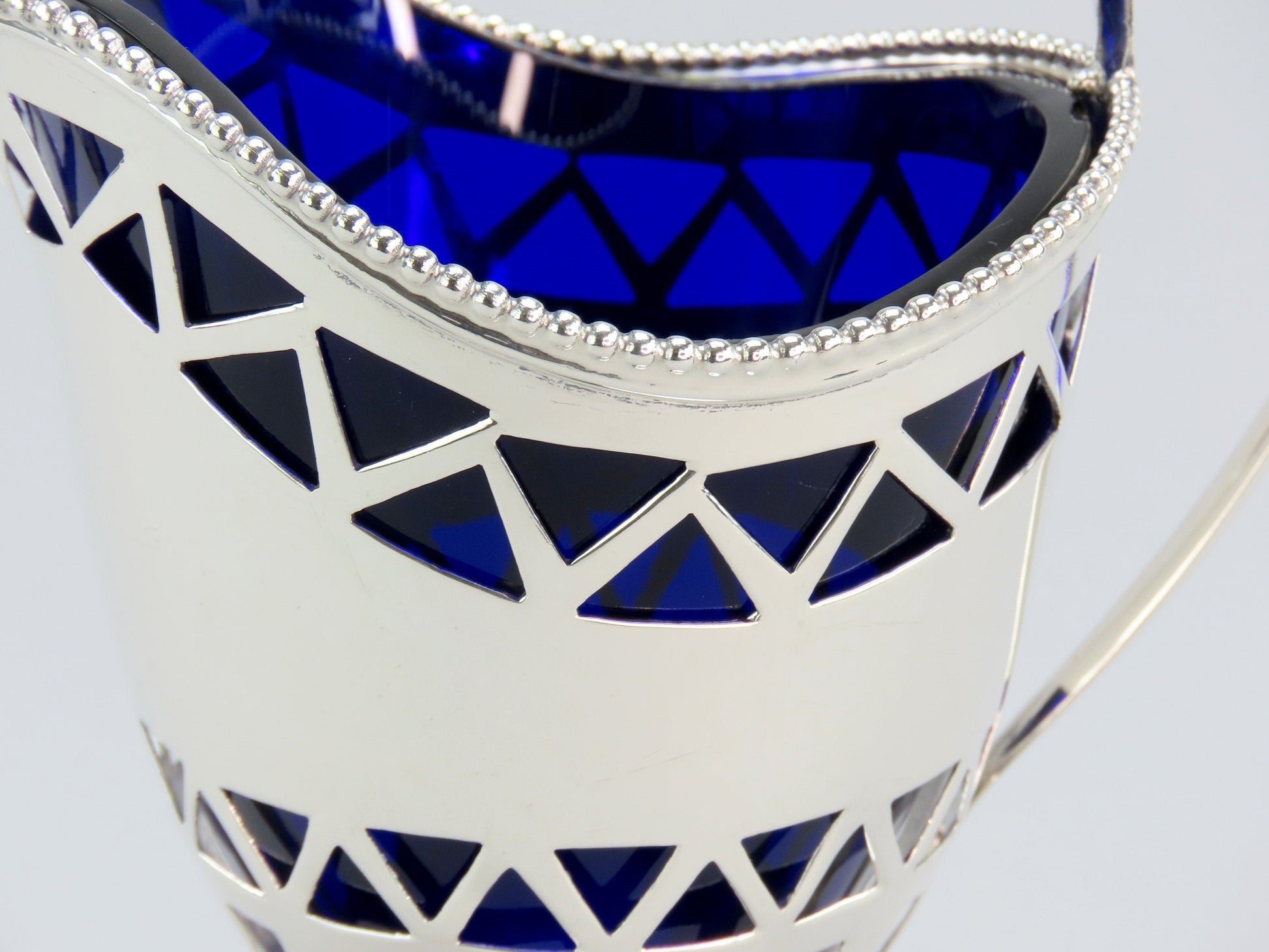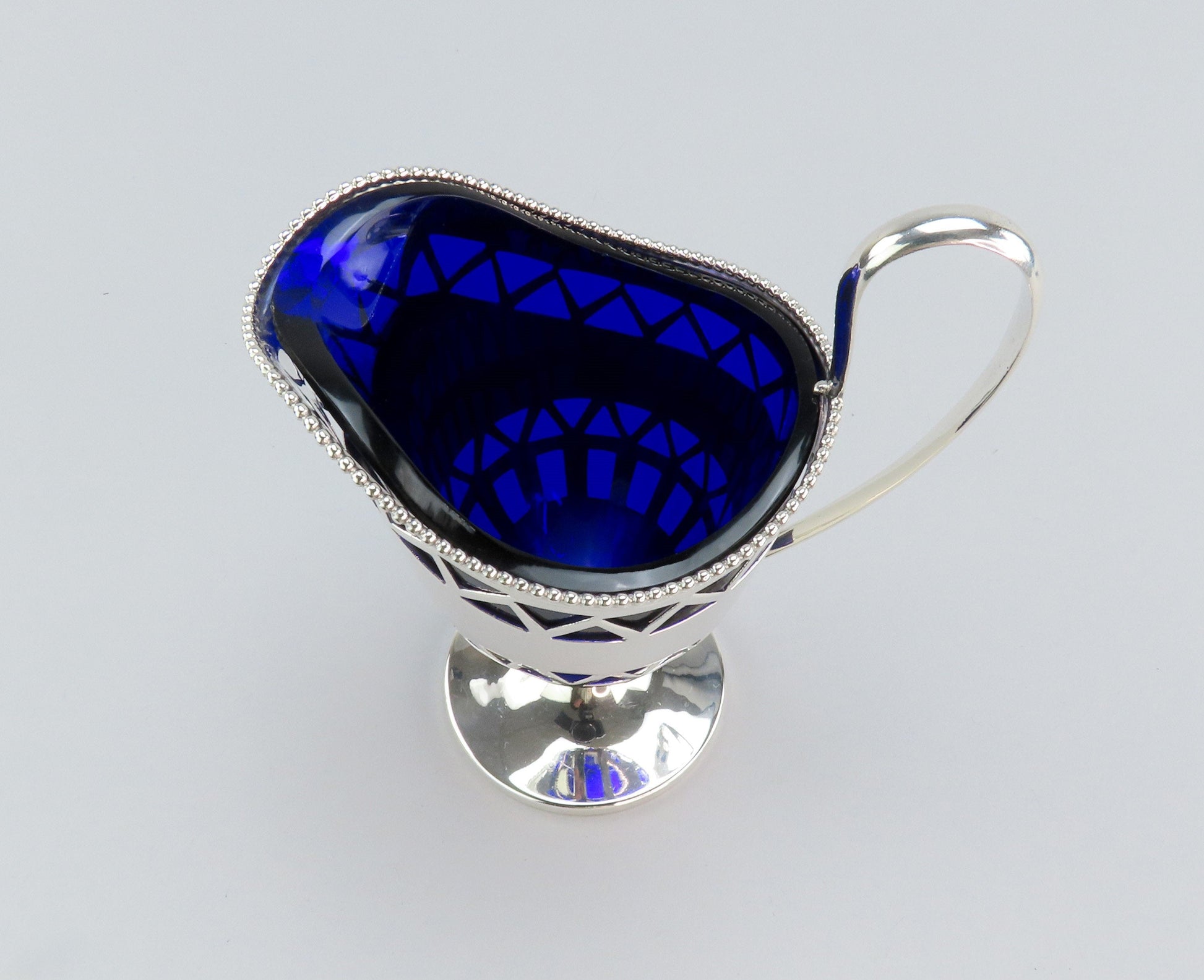 Presented is a gorgeous antique American sterling silver creamer with its original hand blown cobalt blue glass liner. This piece dates to circa 1900 and was made by Nevius, a New York maker. The creamer is crafted in the classic helmet form, with a band of geometric openwork decoration around the top and bottom, allowing the deep blue glass to show through the silver beautifully. The rim of the creamer has a bold beadwork design along its edge.