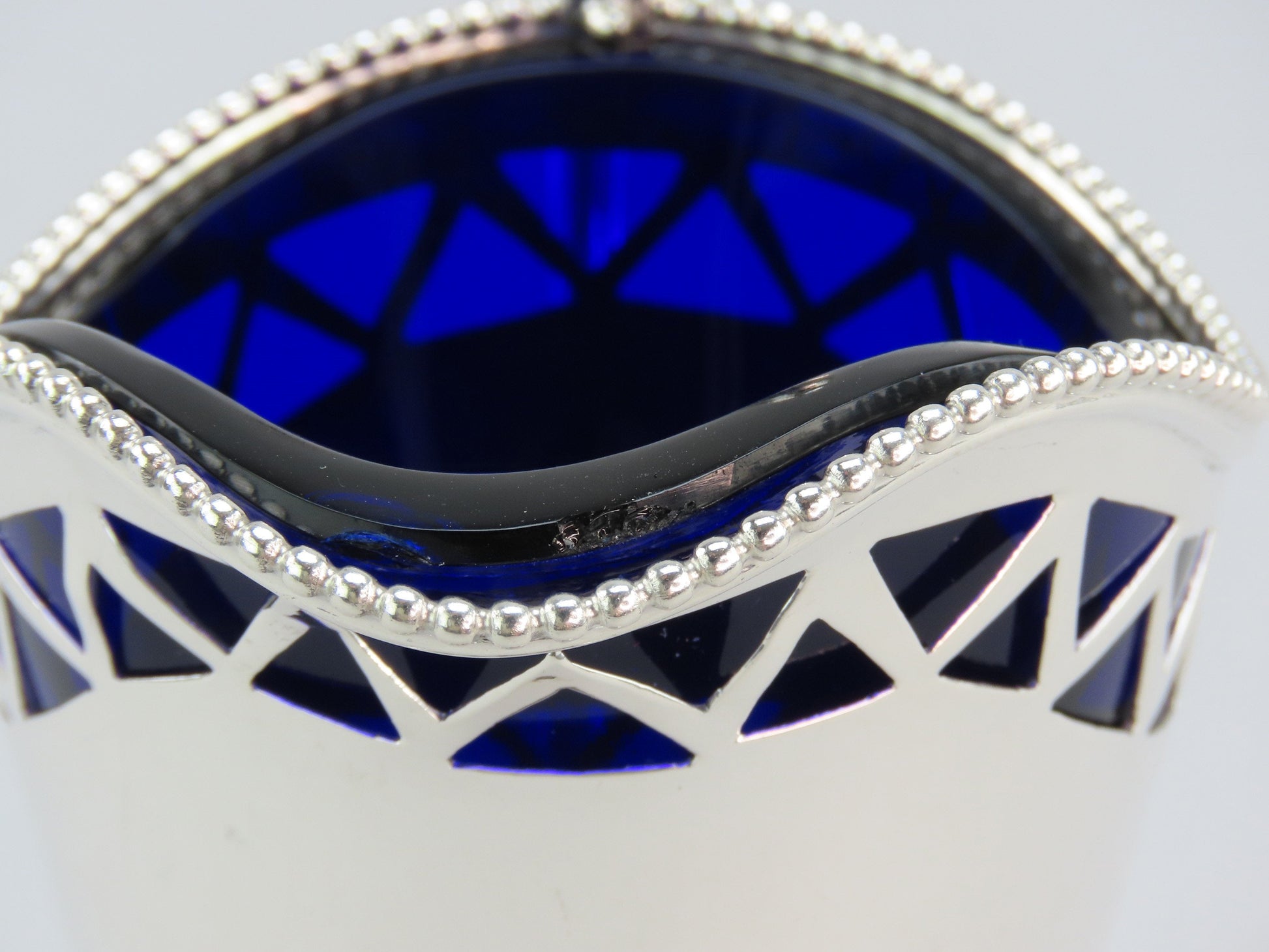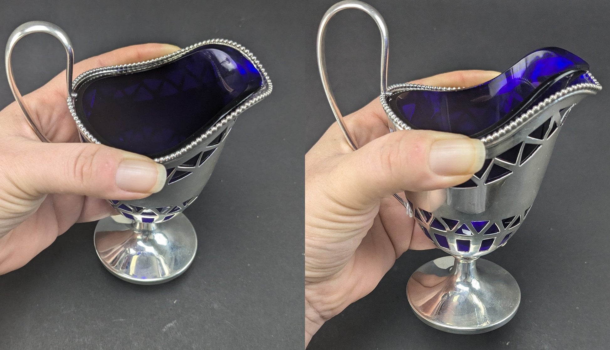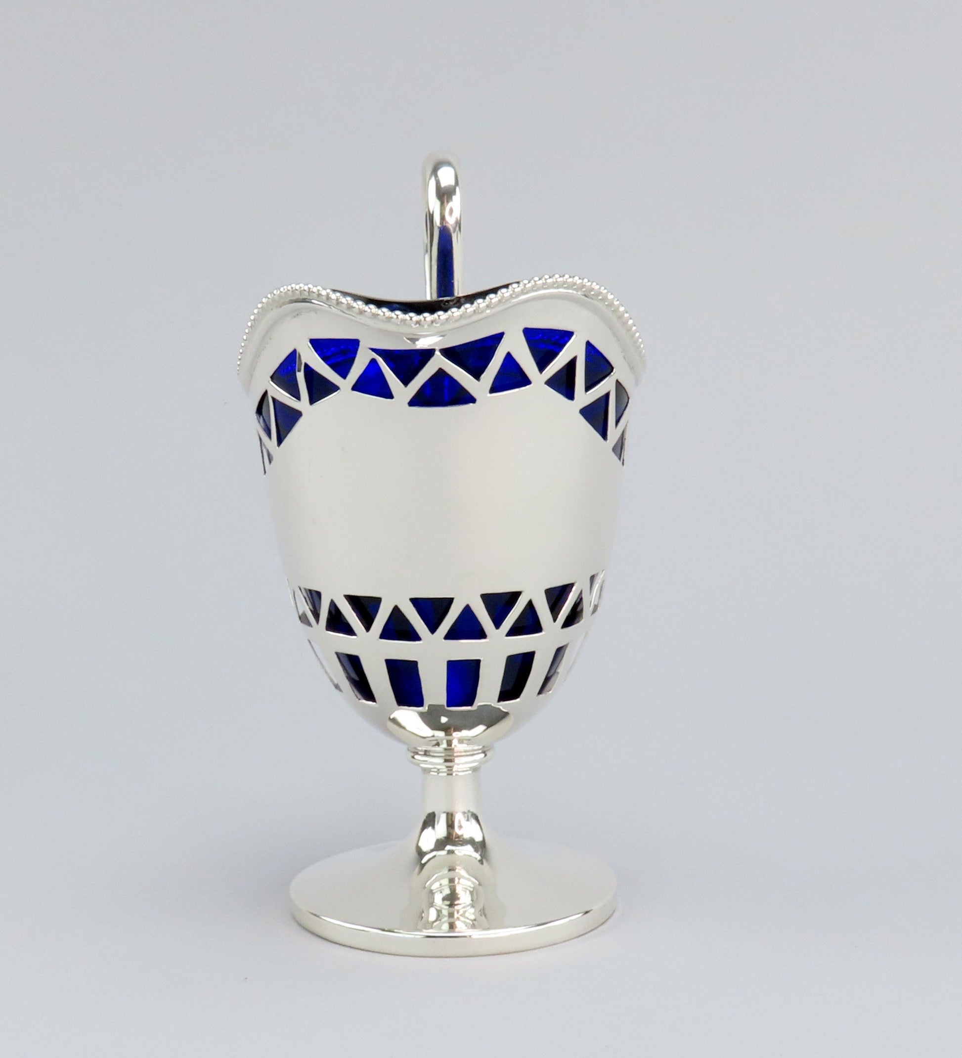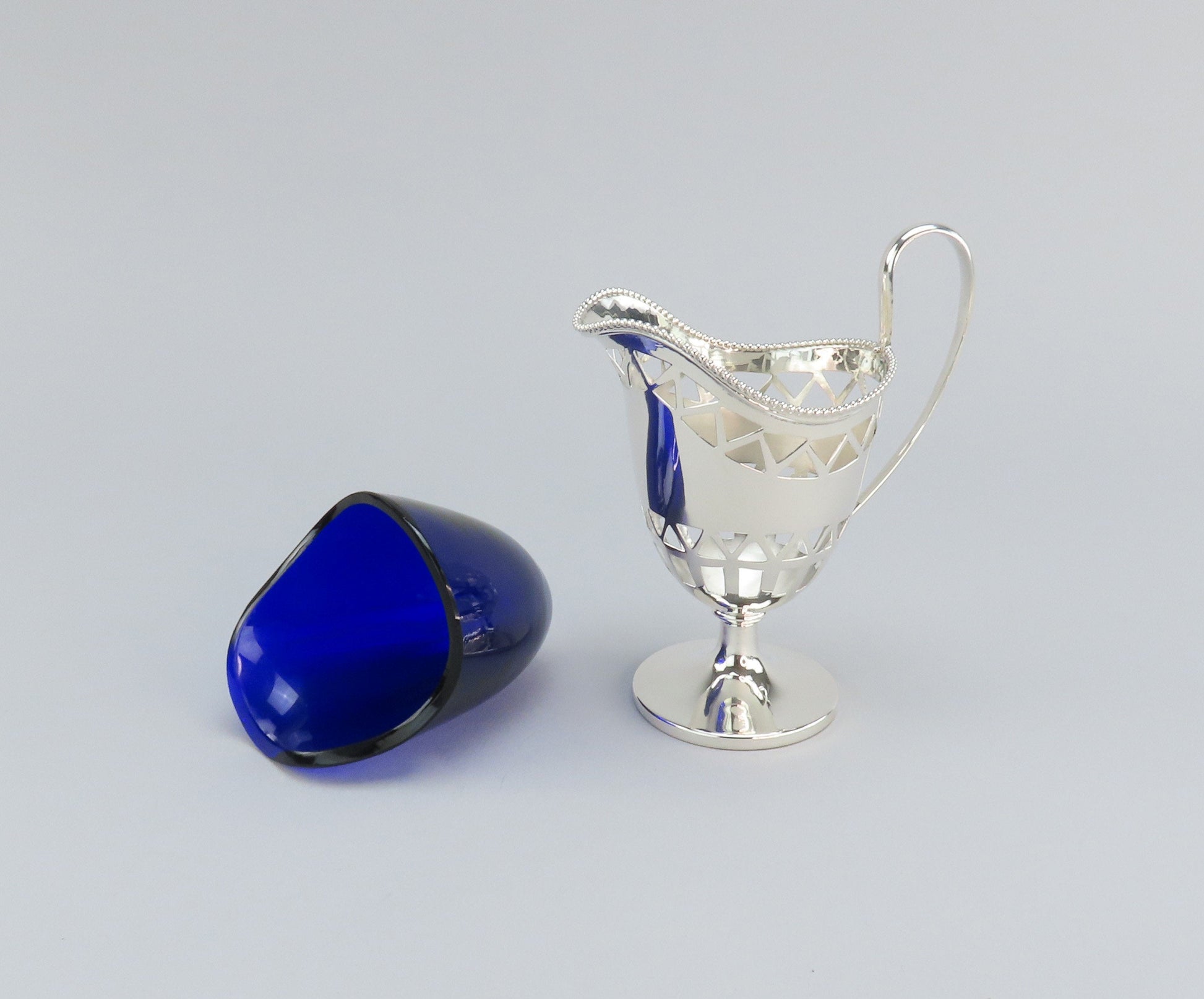 Presented is a gorgeous antique American sterling silver creamer with its original hand blown cobalt blue glass liner. This piece dates to circa 1900 and was made by Nevius, a New York maker. The creamer is crafted in the classic helmet form, with a band of geometric openwork decoration around the top and bottom, allowing the deep blue glass to show through the silver beautifully. The rim of the creamer has a bold beadwork design along its edge.