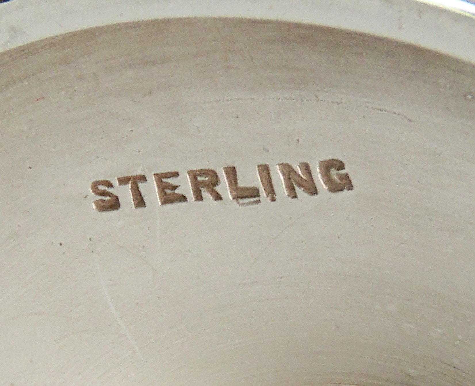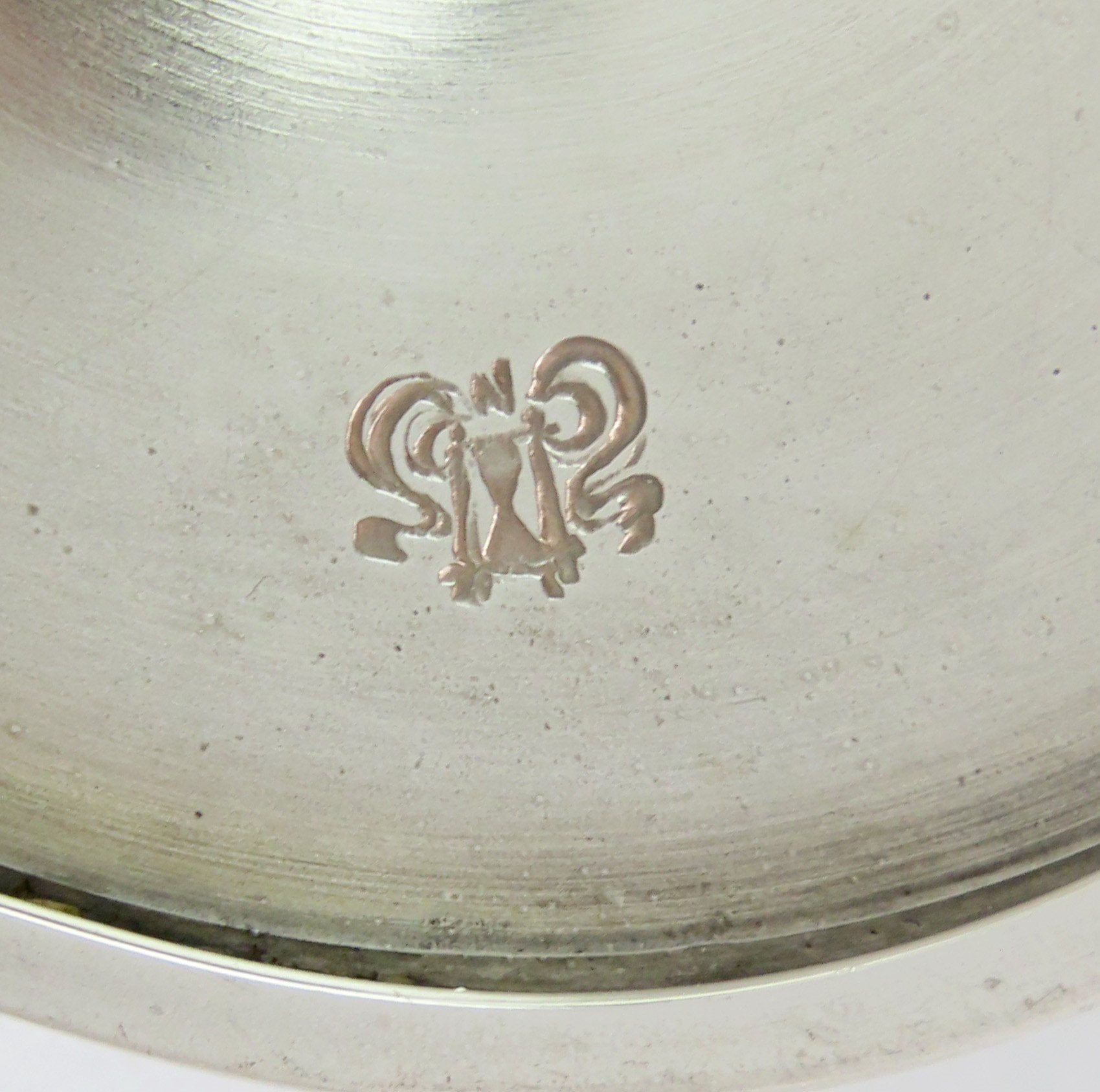 On the underside of the creamer's foot is the maker's mark for Nevius and sterling. The creamer is in great overall condition. There is a small chip to the glass liner, at the underside of the end of the spout, which is only visible when the liner is removed. The silver is in excellent condition, with no splits, no dents, no monograms, no monogram removals, and no repairs.