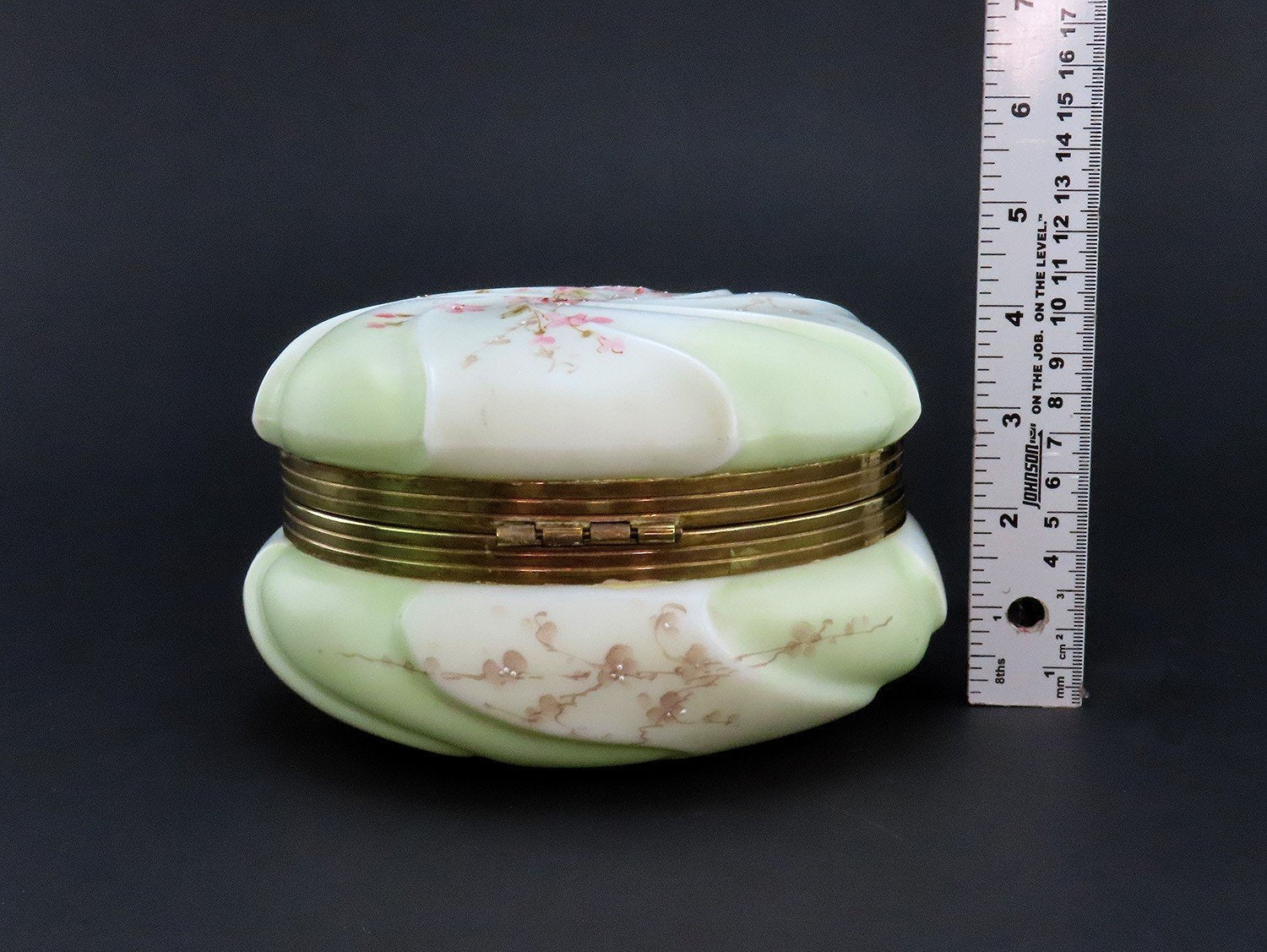 Presented is a wonderful antique Wavecrest opalware glass dresser box, dating to circa 1890-1910. The box is beautifully hand painted with a delicate design of pink flowers on leafy branches, against a fresh green background. The mounts of the box are brass, in a reeded collar around the midpoint. This is an uncommonly large Wavecrest box, great as a dresser box or small jewelry box, rather than the smaller size trinket boxes more commonly available for sale.