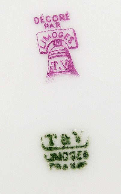 The plates are marked on the underside with Limoges France in green with the initials T.V. above it, and with a bell maker’s mark for Tressemann & Vogt in red. This maker’s mark was used from around 1907 to 1919. One of the plates only has the Limoges mark with the initials in green.