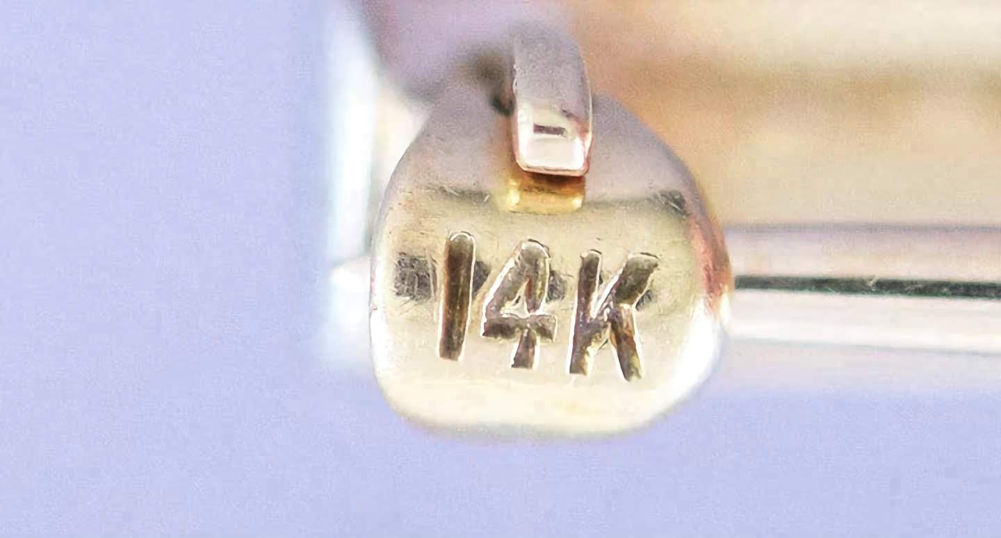 The pin is stamped 14k on the clasp. We have tested the white metal of the front with nitric acid and guarantee it to be platinum.
