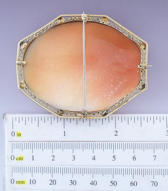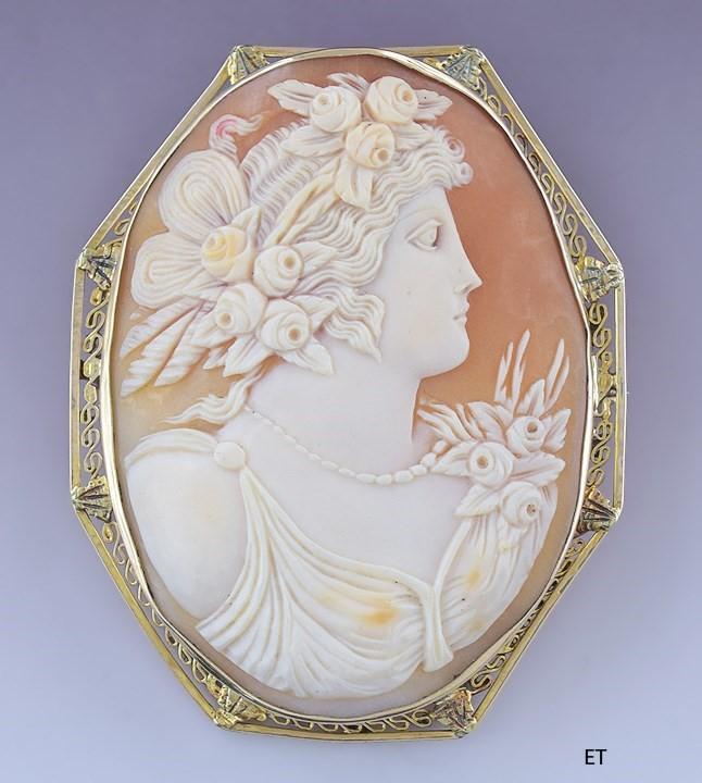 expression. The cameo is set in a lovely octagonal 14 karat gold filigree frame
