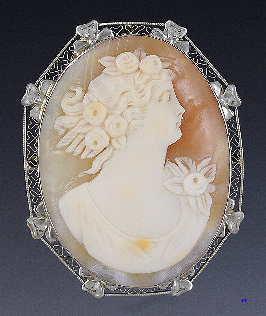 Presented is a wonderfully hand carved, natural shell cameo set in a 14 karat white gold mounting made around 1910-1930. The cameo was carved in Italy and the mounting was made in America. The large cameo is delicately carved into the profile of a pretty woman with roses in her wavy hair. The cameo is done in high relief and is very detailed. The 14 karat gold mounting is done in a fabulous filigree form and has separately cast and applied little florettes along the border. The back of the mounting has a hinged bale or loop for hanging the piece as a pendant if so desired. The clasp has a locking mechanism for added security.