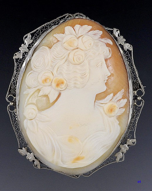 Presented is a beautifully hand carved, natural shell cameo set in a 14 karat white gold mounting made around 1910-1930. The cameo was carved in Italy and the mounting is American in origin. This cameo is a good size and weight, we are guessing about half of the weight of this piece is gold weight alone. The large cameo is delicately carved into the profile of a pretty woman with roses in her wavy hair. The cameo is done in high relief and very detailed. The carving is much better than most. The 14 karat gold mounting is done in a fabulous filigree form and has separately cast and applied little leaf decorations at the corners. The back of the mounting has a hinged bale or loop for hanging the piece as a pendant if so desired. The clasp has a locking mechanism for added security.