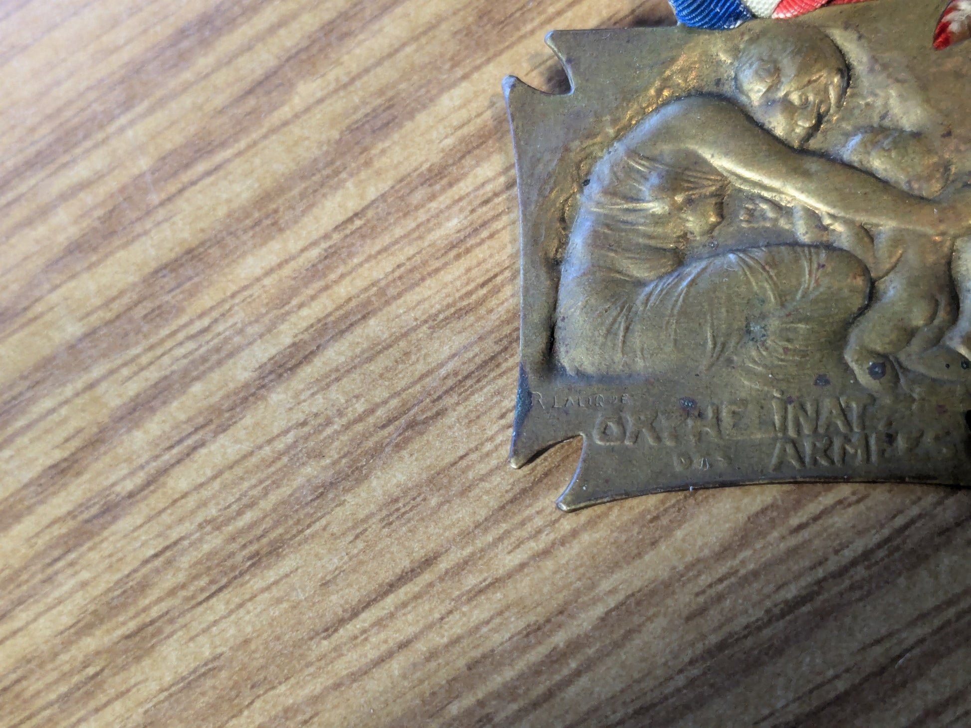 Presented is an antique “Orphelinat des Armees” (Orphans of the Army) charity medal from World War I, designed by Rene Lalique. The medal depicts a seated woman in clinging, draped clothing embracing two orphans. The medal is brass, on a short length of ribbon in the colors of the French flag.