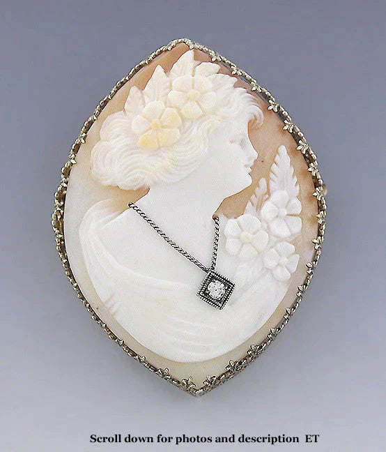 Presented is a lovely carved cameo set in 14 karat white gold. This piece dates to around 1910-1930. The carving is probably Italian, while the setting was likely done in America. The cameo is done in an elongated oval form, set in a fancy prong mounting with filigree sides. The cameo depicts a pretty young woman in profile, with flowers in her hair and a diamond necklace around her neck, set with a real diamond. This is a vibrant little stone of about 3 points in size. The cameo is quite detailed and well carved, and this is a beautiful piece of jewelry.