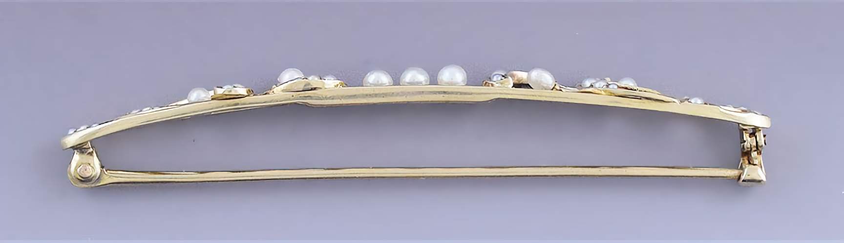 The pin is in great condition. The pearls are all intact, securely mounted and in good shape. One pearl may be a replacement, or it may just be a little off round, however this is extremely hard to notice without careful inspection. The clasp functions well and closes securely.