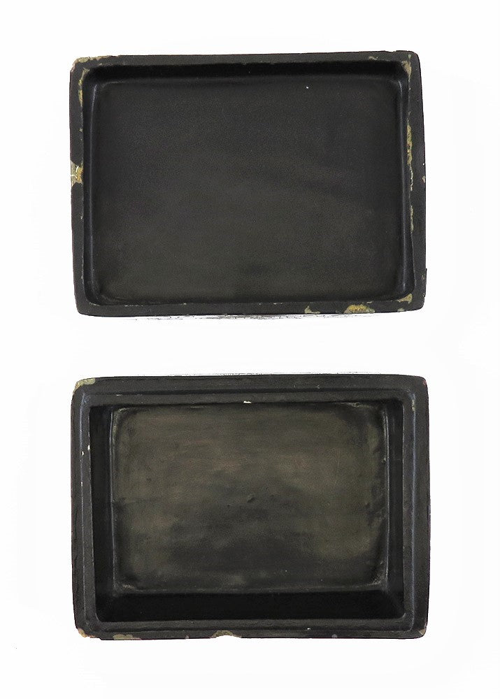 Condition: The box is sound and the designs retain great color and clarity. There is no damage at all to the inset porcelain. The box's exterior has some flaking to the lacquer, and chips can be seen around the box's rim: 4 on the bottom rim, and three to the top rim are fairly significant. Our photos will show you in nicely focused detail if you view them at maximum size.