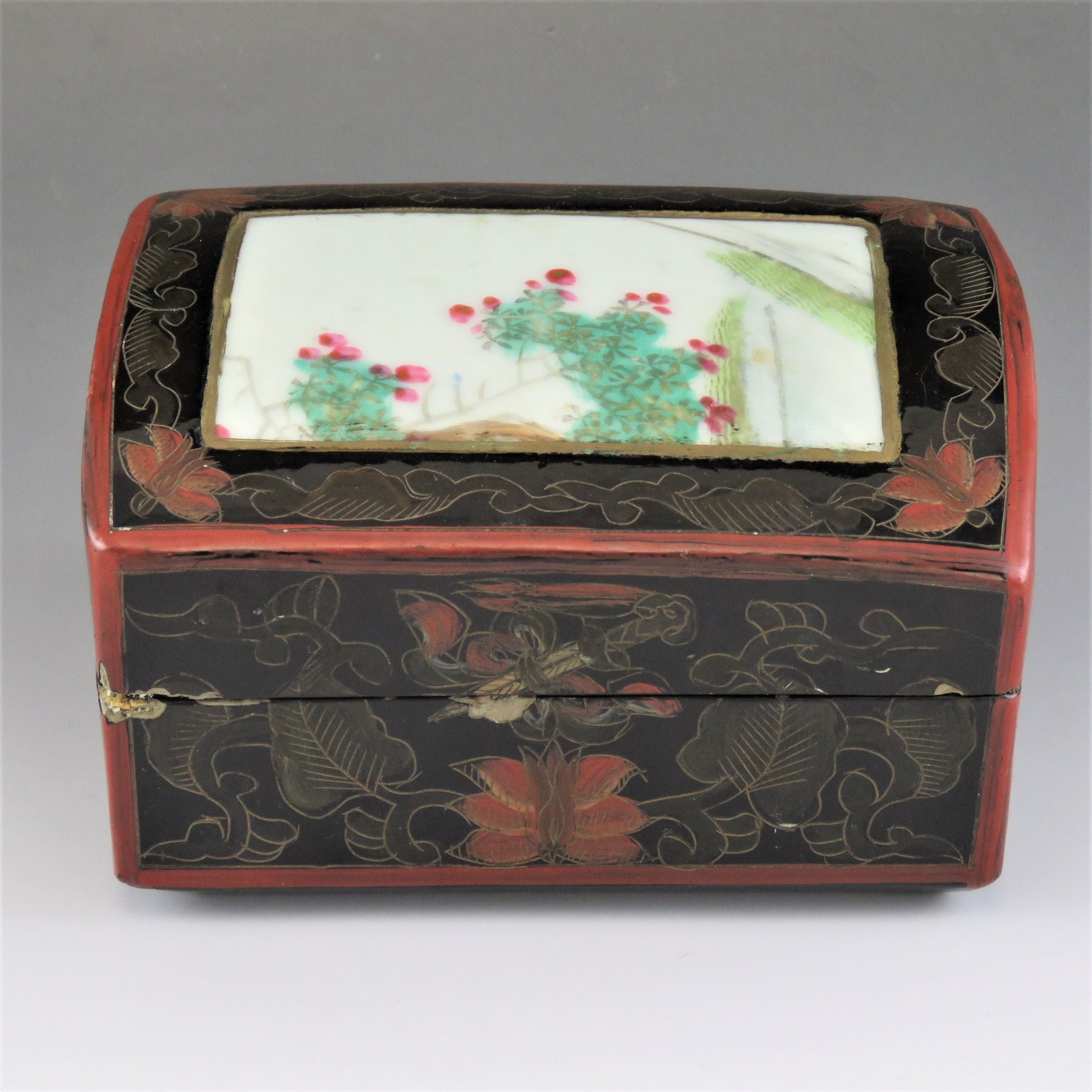 c1920s Antique Chinese Lacquer Box With Painted Roses on Porcelain Inlay