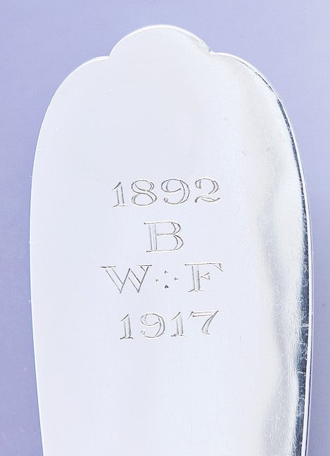 Presented is a fabulous Porter Blanchard sterling silver stuffing spoon. This piece is done in the stylish Lotus pattern, which began production in the 1910s-1920s. As such, this pattern has an attractive Art Deco design, very simple and clean. This is a beautiful handwrought piece, with the marks of hand hammering visible in the finish of the back of the bowl. The spoon has a large bowl and a long handle, with a knob stop on the back of the handle so the spoon can be rested against the side of a pan. The back of the handle has a 25th anniversary presentation reading 1892 B W+F 1917. This is a versatile server that can be used for a variety of serving purposes besides stuffing.