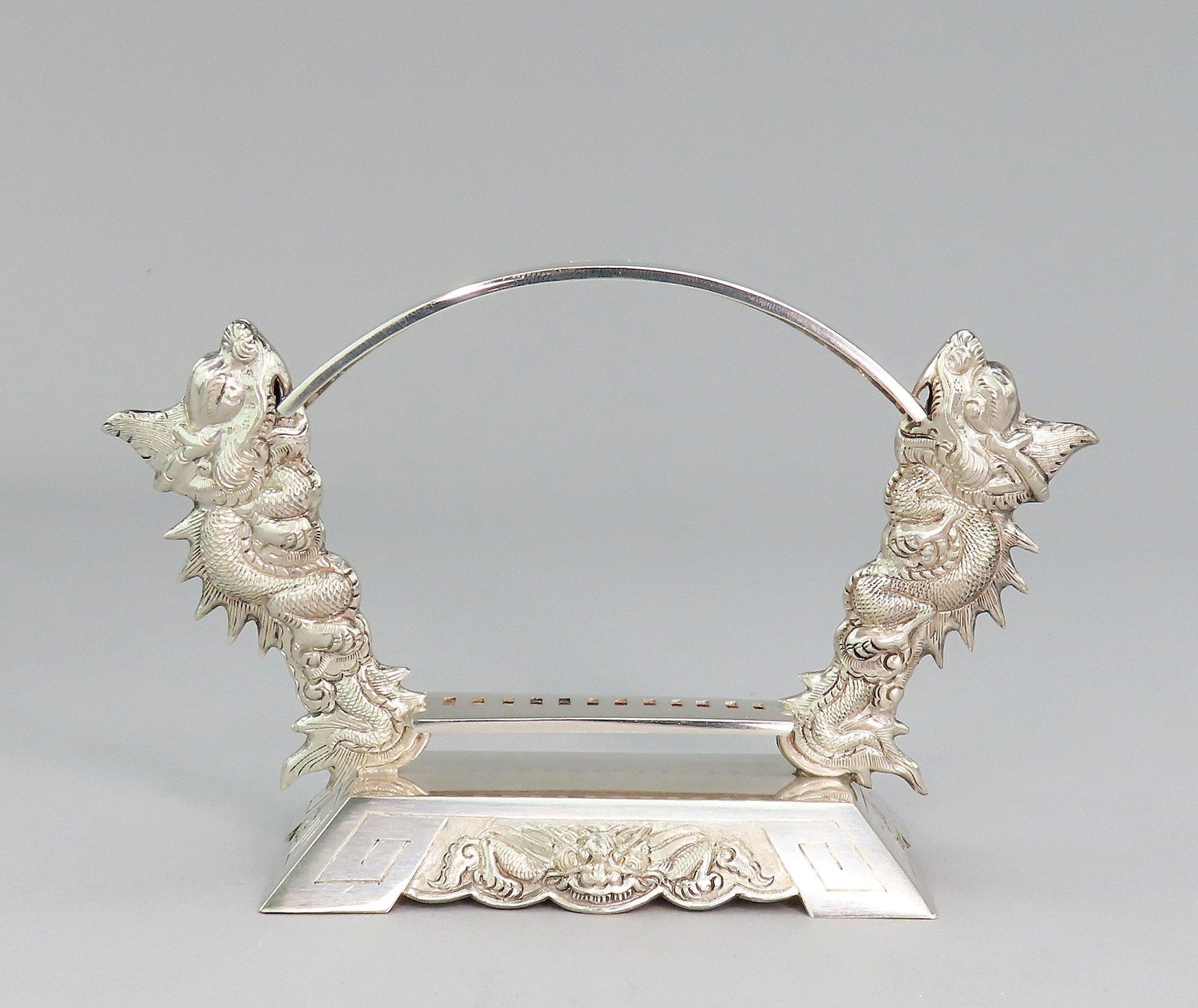 Presented is an interesting set of 12 Vietnamese silver food picks from the early to mid-1900s. This set, likely produced in the 1930s, displays a fancy stand with dragons on either side and spear-shaped food picks with a dragon head decoration at the top of each pick. The stand holds 12 picks. We have all 12 picks.