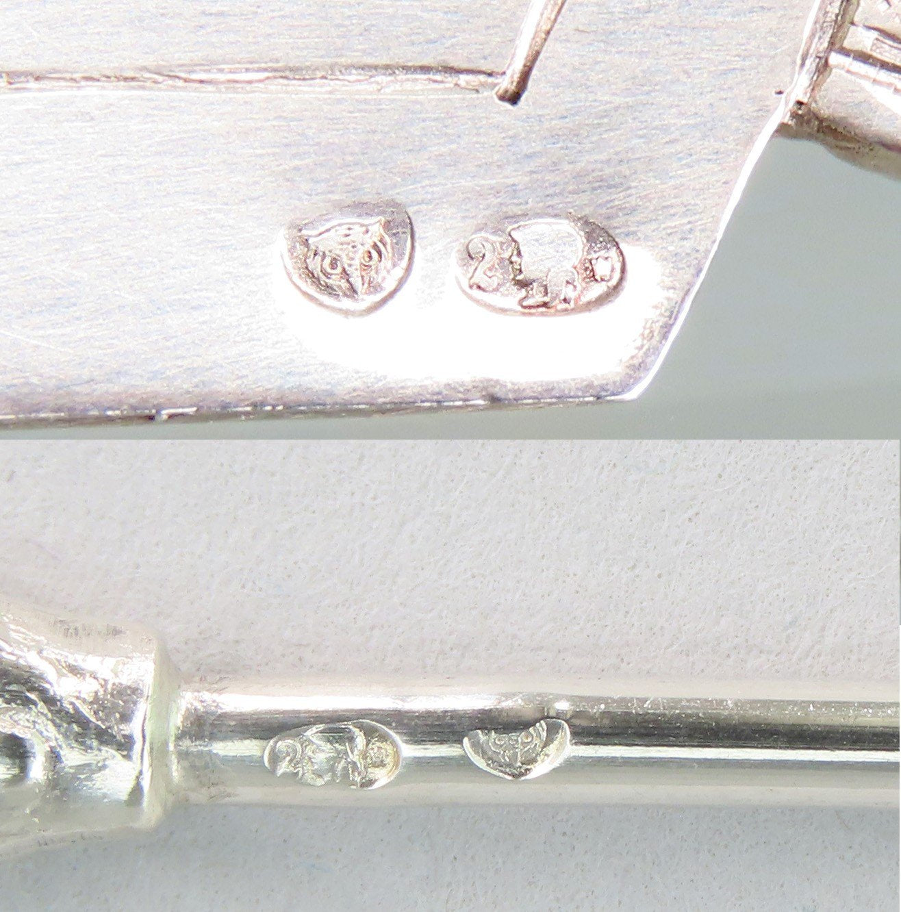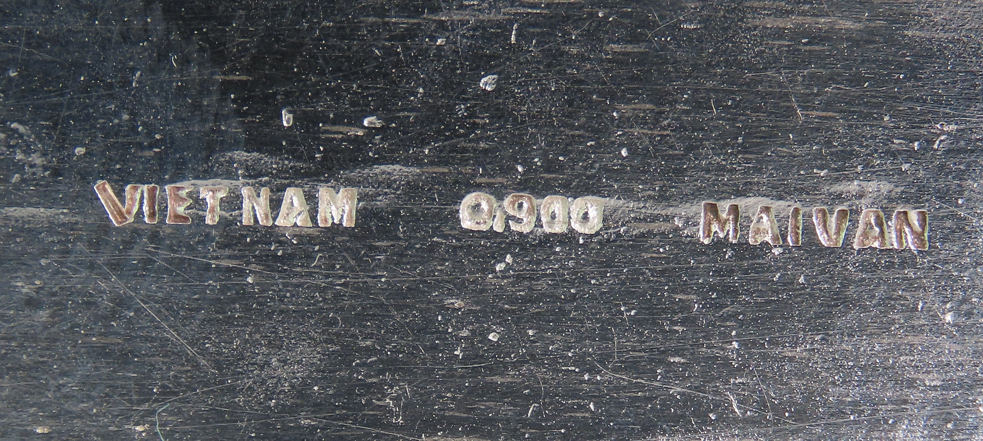 The underside of the base is marked 900 purity silver, Vietnam, and “MAIVAN”. Each pick and the base are marked with Polish import hallmarks: the 2nd standard mark for at least .875 purity silver and owl Lombard mark. This set was made in Vietnam and exported to Poland.