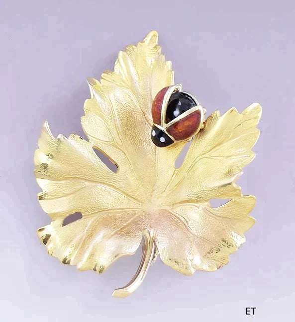 Charming 14k Gold & Enamel Ladybug on a Leaf Pin / Brooch / Pendant