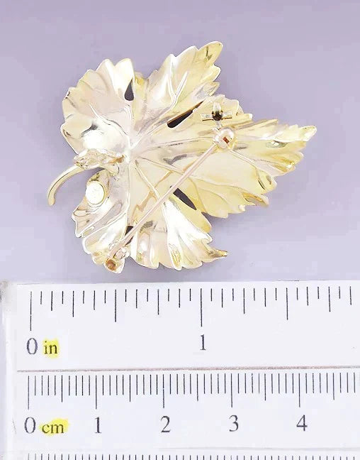 The pin is in great condition. The textured finish of the leaf's front is in great shape. The enamel on the ladybug is all intact. The clasp functions well and closes securely.