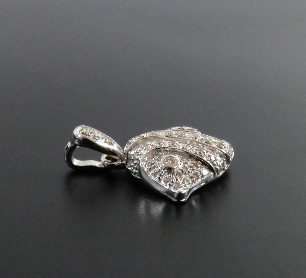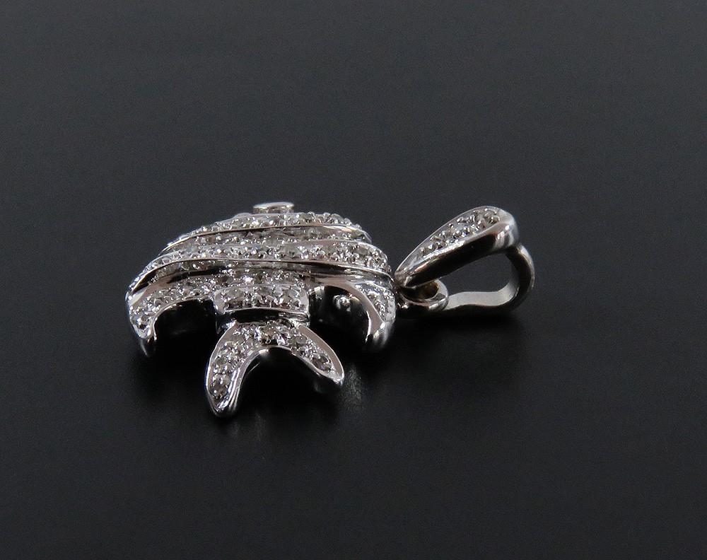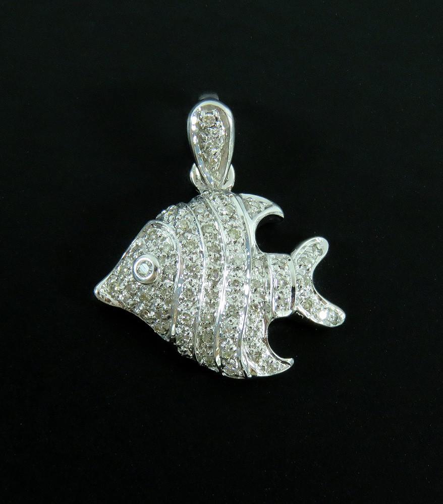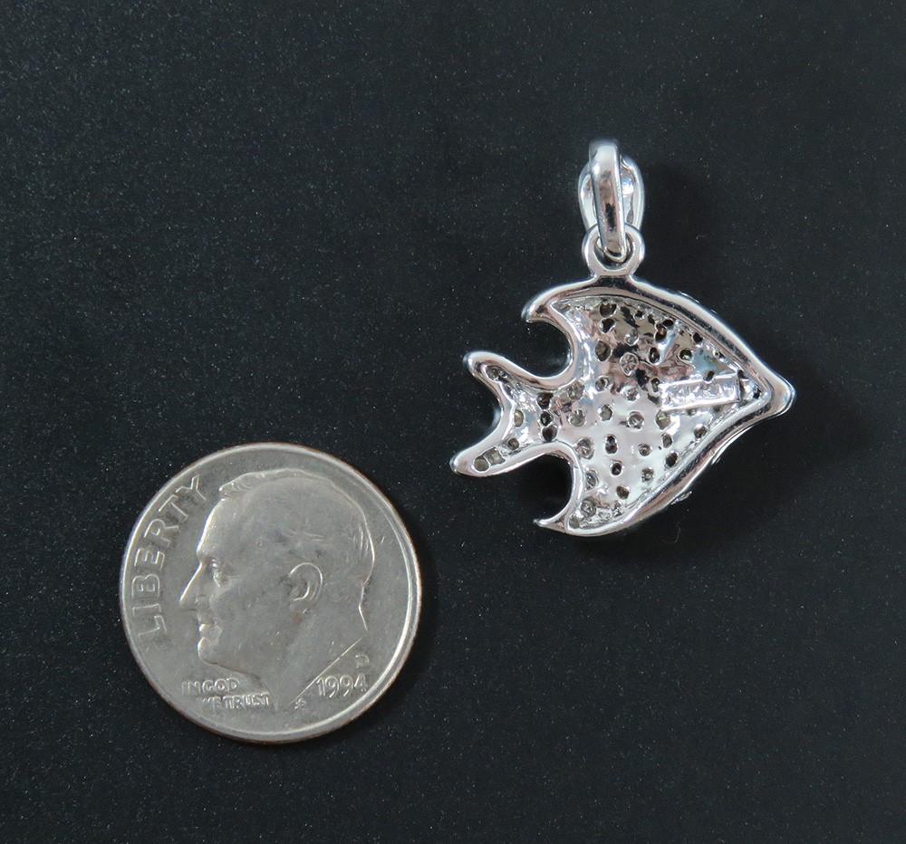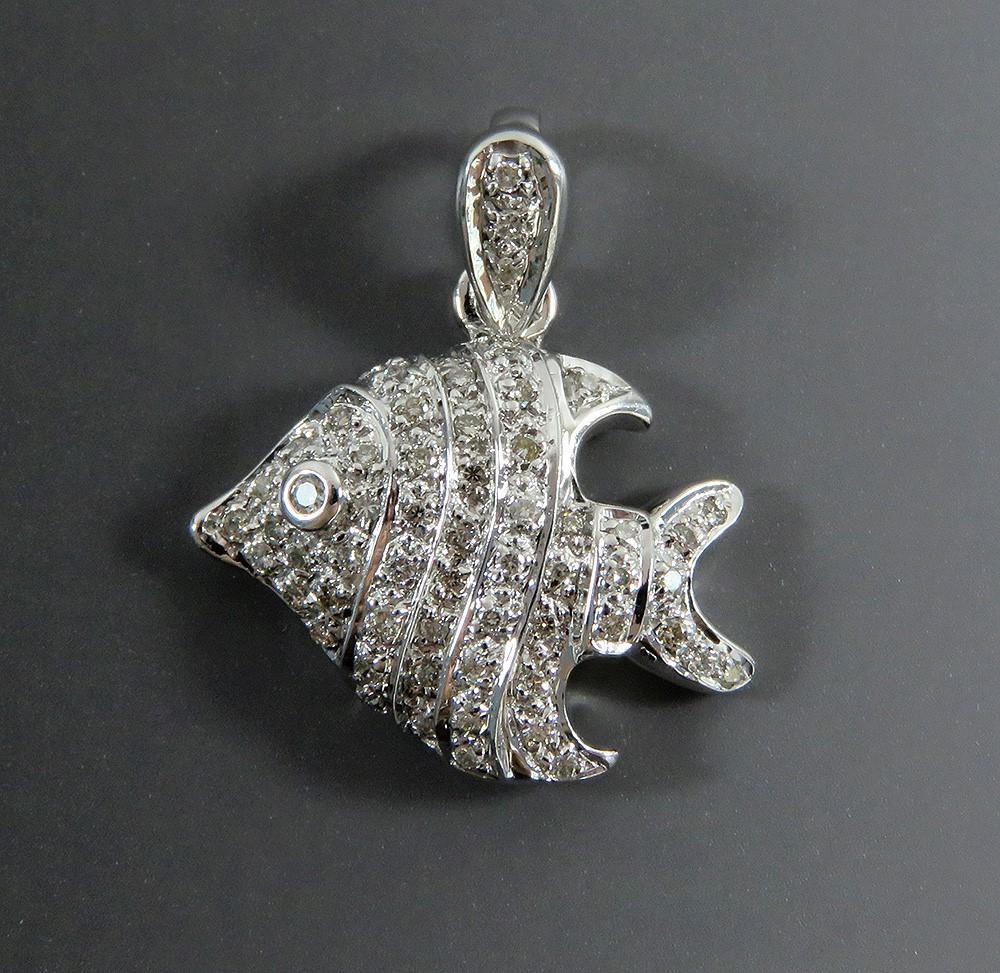 Presented is a charming little 14 karat white gold and diamond pendant in the form of a fish. This is a relatively contemporary piece, likely of American make. The fish is a tropical type, like an angelfish or maybe a clownfish, with the impression of markings given by raised stripes alternating with recessed stripes. The entirety of the piece is set with modern brilliant cut diamonds, including the bail and even a little diamond in a round bezel for the fish's eye. There are 55 diamonds total, all less than a point each in weight, but full of life and sparkle. The bail/loop at the top is a decent size, with interior measurements of about 4.7 by 3.2 millimeters.