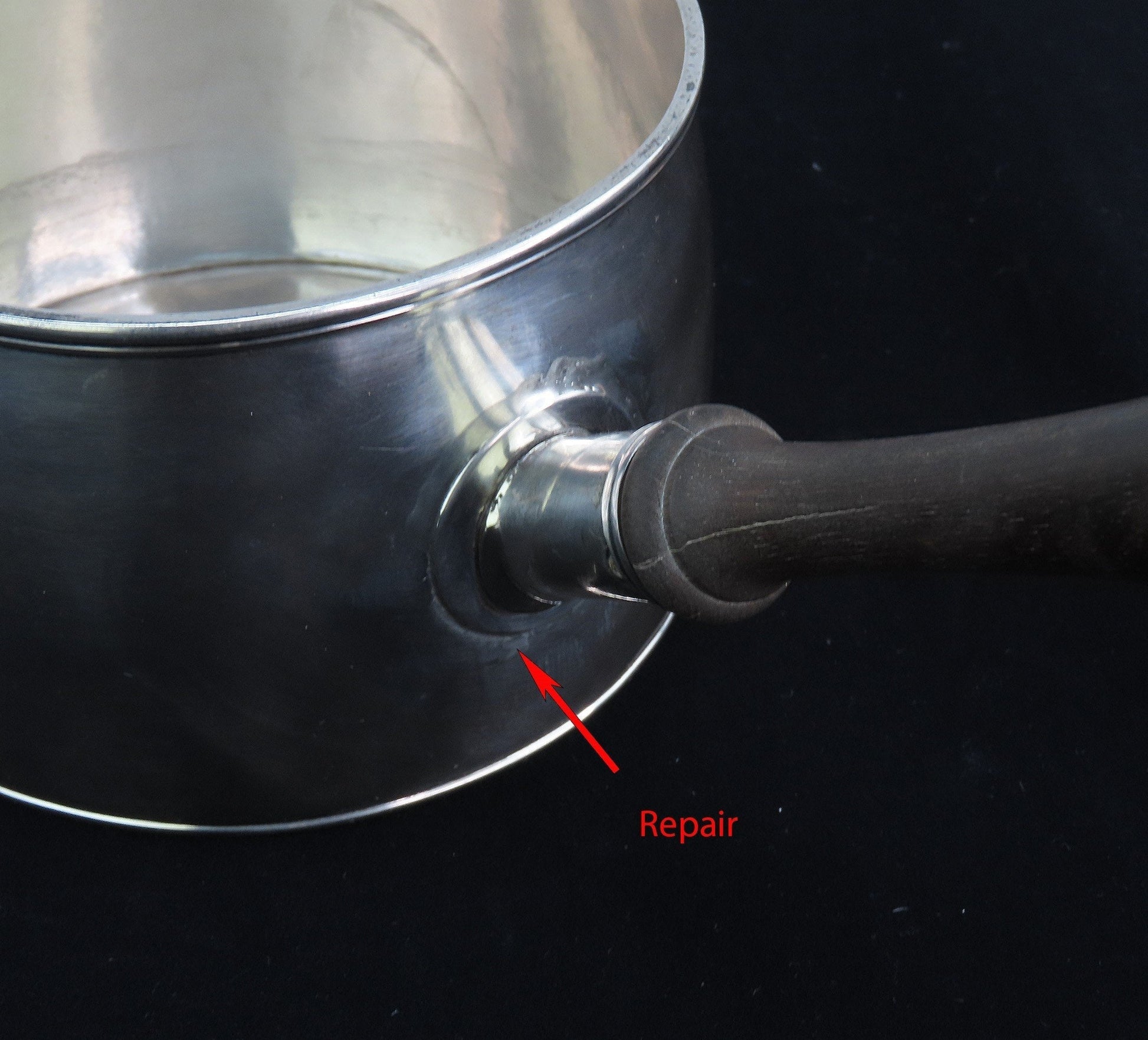 This piece is in good overall condition. There is an old solder repair where the handle meets the body, visible from the exterior as a wider silver “patch” around the handle. This repair is pointed out in the interior in the tenth photograph and the exterior in the ninth photograph. The body of the warmer has a couple of fairly minor dents here and there, the most noticeable of which is visible in the eighth photograph. The handle has a minor split or age line part way along its length, but this does not extend all the way through or all the way to the joint, and the handle still feels quite sound. There are no splits to the silver, no leaks, no monogram removals, and no repairs.
