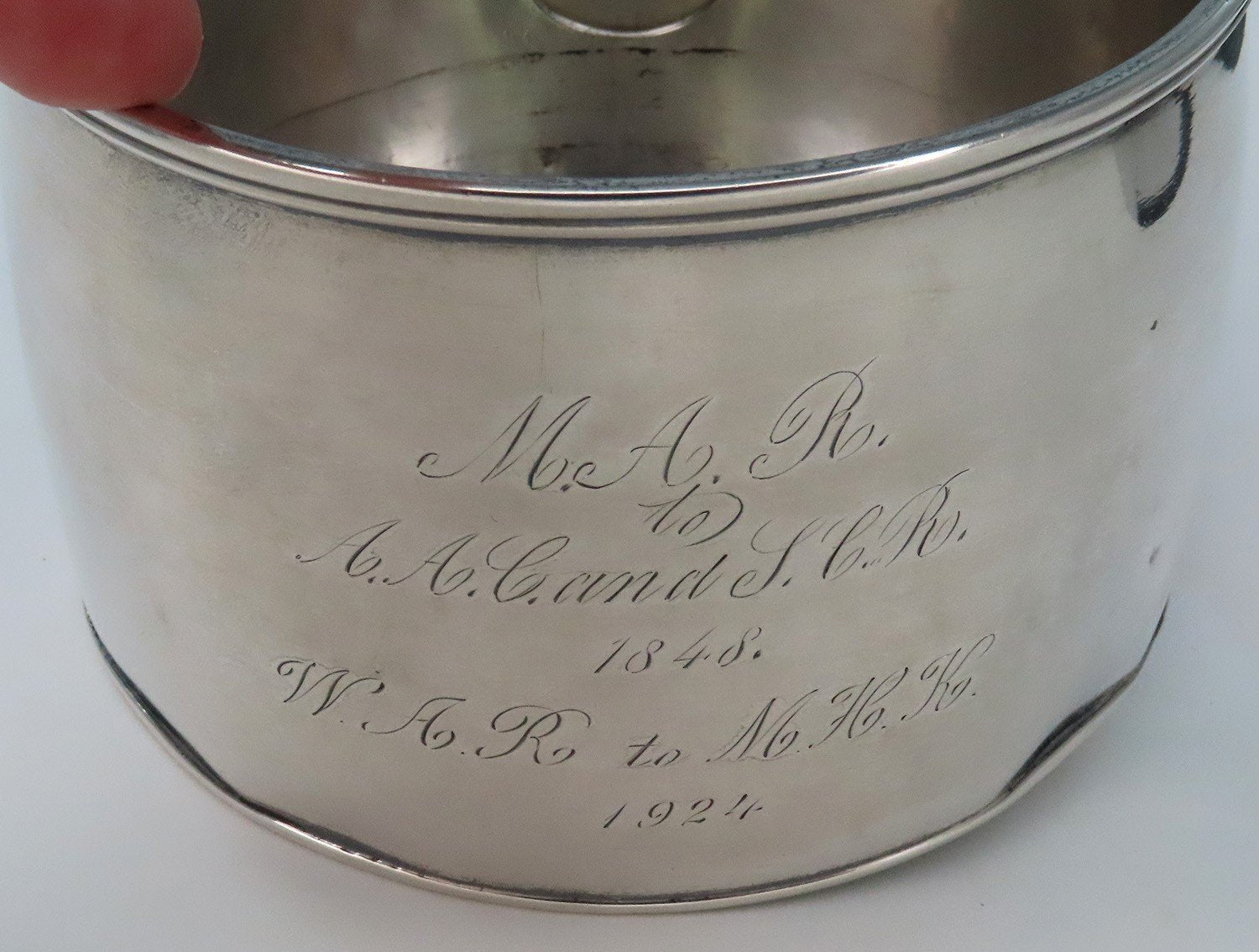 Presented is a wonderful antique American coin silver pipkin or brandy/sauce warmer, made by John Goodhue and dating to circa 1848. The pipkin is made in a simple, clean-lined style, with a reeded lip around the top and a finely turned wooden handle. The front of the piece, opposite the handle, is nicely engraved with a presentation reading “M.A.R. to A. A. C. and S. C. R 1848” and then “W. A.R. to M.H.K. 1924.” So a charming silver heirloom that has been presented twice, 76 years apart.