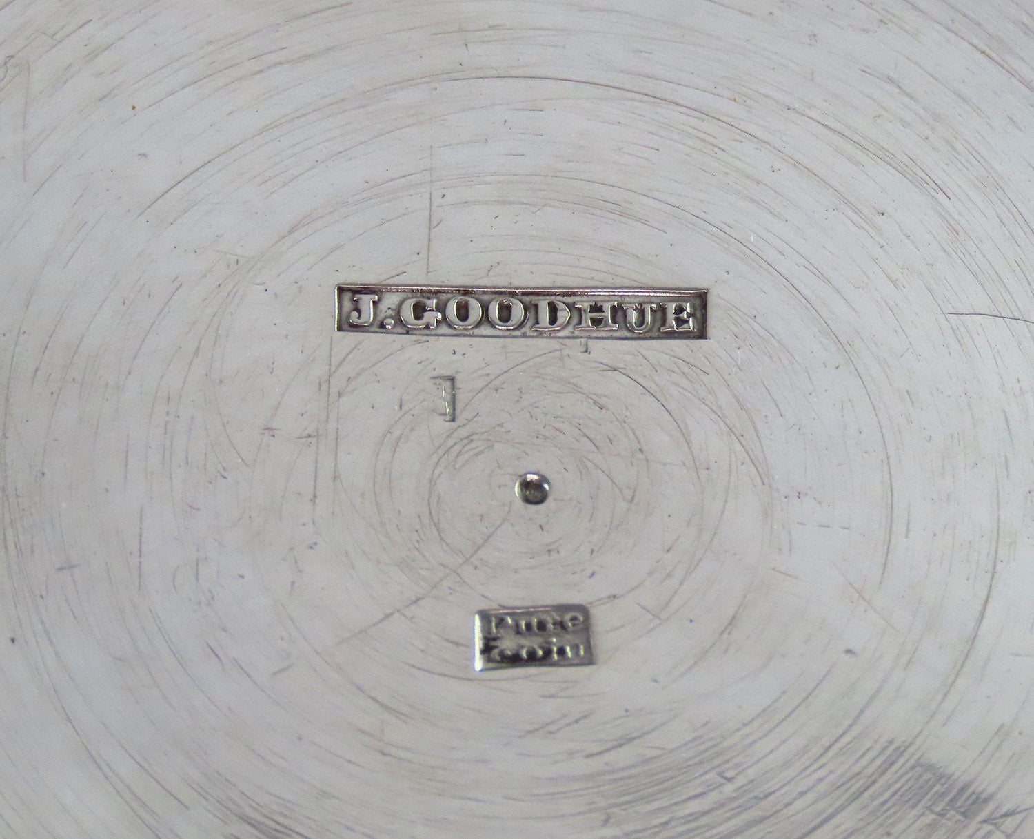 The underside is stamped with the maker's mark of John Goodhue, a Salem, Massachusetts silversmith active circa 1822-1855, as well as “Pure Coin” for 900 purity silver.