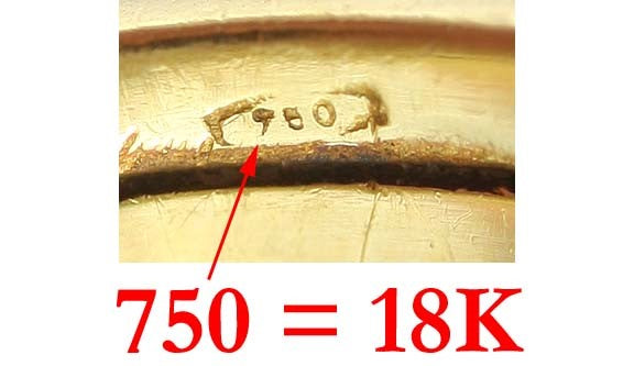 The ring is marked on the inside of the band with 750 for 18K gold. This ring was made in Italy in the past 30 or 40 years. We have tested the ring with nitric acid and guarantee it to be 18K gold.