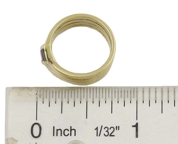 Presented is an elegant 18K gold, diamond, ruby, sapphire and emerald ring. The ring is composed of four gold bands, each set with a different gemstone. Each stone measures approximately 2 millimeters by 3 millimeters. The four bands are soldered together to form a pretty ring. The diamond, ruby and sapphire are all fine quality stones. The emerald is also a nice stone that has some surface abrasions. The emerald, and all of the stones, certainly looks better in person than in the photos.