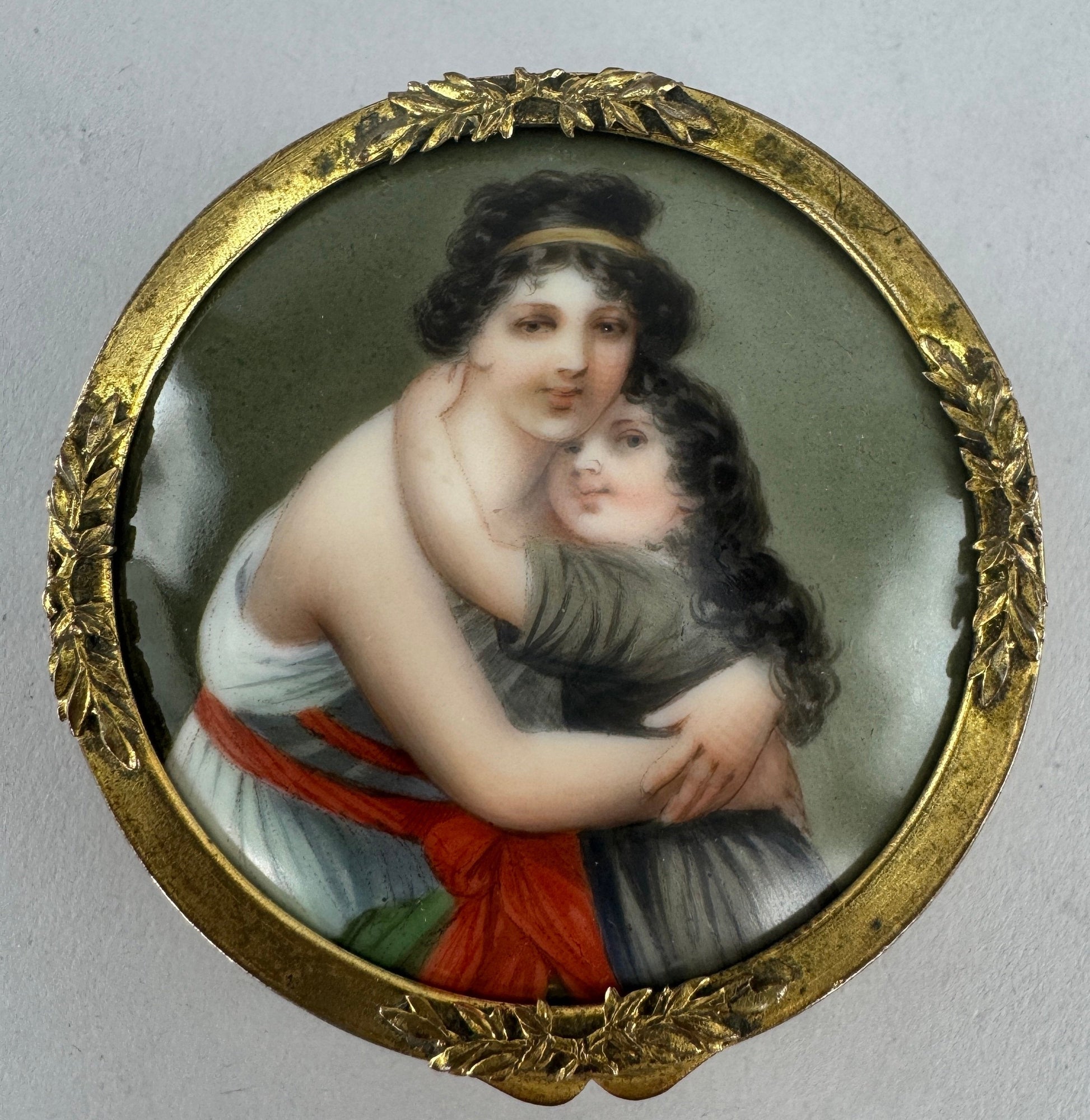 Presented is a superb quality gilt bronze trinket or sewing notion box set with a miniature portrait in the lid, dating to circa 1880-1910. The box is likely French, and the painting is after a 1789 piece by renowned French portrait artist to Marie Antoinette, Elisabeth Vigee Le Brun, her self portrait with her daughter Julie. This hand painted copy of the painting is beautifully executed with considerable skill, full of lively but soft detail, depicting Elisabeth in white and red embracing her daughter in grey. The gilt bronze body of the box is very ornately decorated as well, with applied laurel leaf designs on the top rim and continuous borders of lamb's tongue, acanthus leaf, and tongue-and-dart decoration around the sides. The interior is lined with fabric which is likely original. The hinges are particularly well made, designed in a way that the lid can't be over-extended when opened.