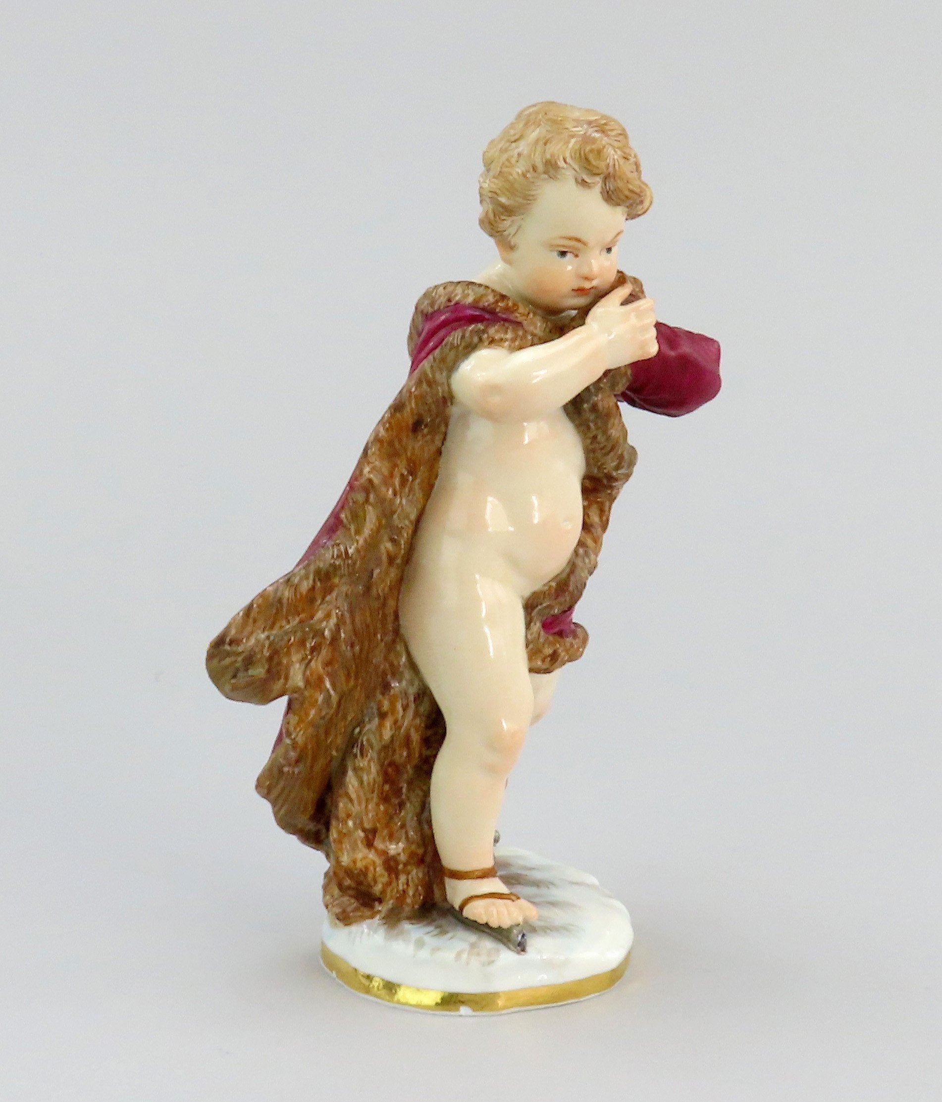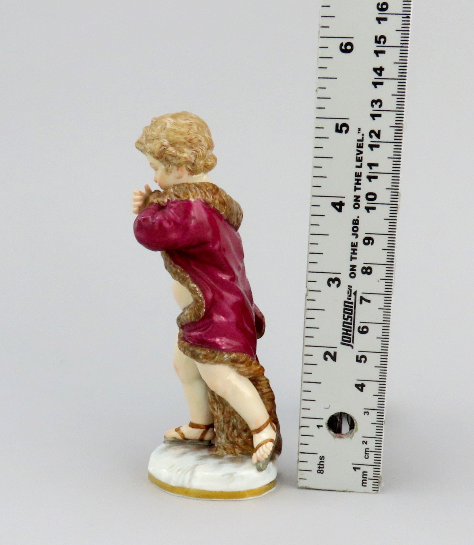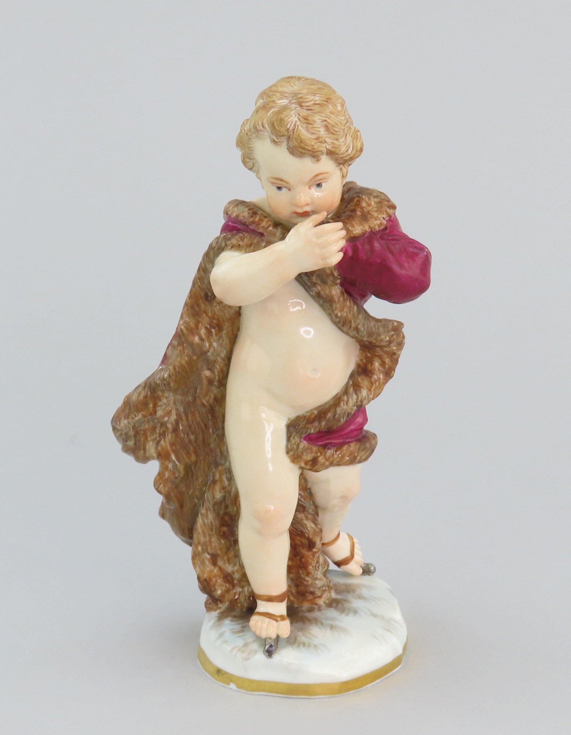 Presented is a very charming 19th century Meissen porcelain figurine of an ice skating putto or cherub, an allegorical figure representing winter. The figurine is exceptionally detailed and well executed, down to the boy's delicately rendered curly hair and the impressive feeling of weight and motion given to the rich fur-lined mauve cloak the figure wears. The figurine is wonderfully hand painted to depict the cherub's chill-rosy skin and the fur texture of the cloak's interior. The quality of the work and the level of detail are superb.