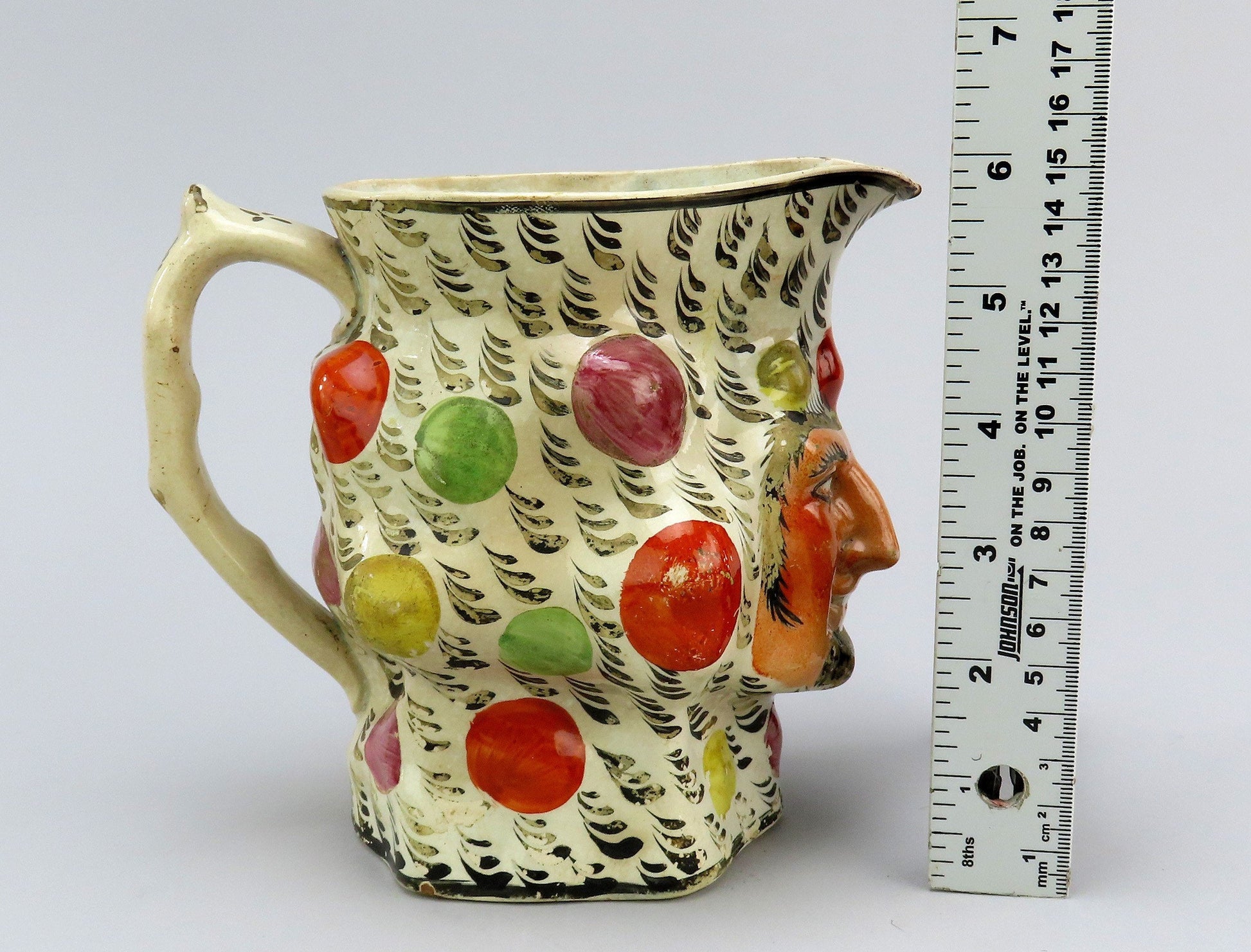 Presented is a charming antique Staffordshire figural milk pitcher or jug, dating to circa 1795-1820. The jug has a grinning, bearded face opposite the handle, surrounded by colorful juggling balls in pink, red, green, and yellow. I have seen this character on jugs called a jester, a juggler, or even a satyr, you be the judge of what he's up to.