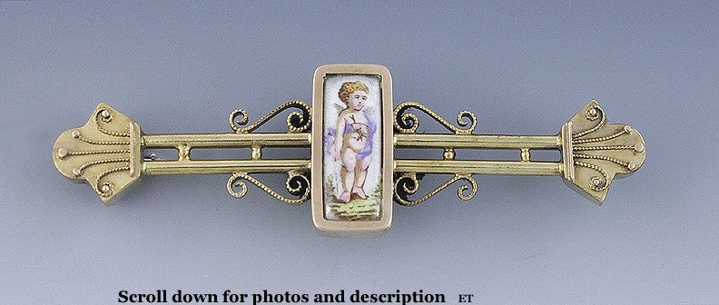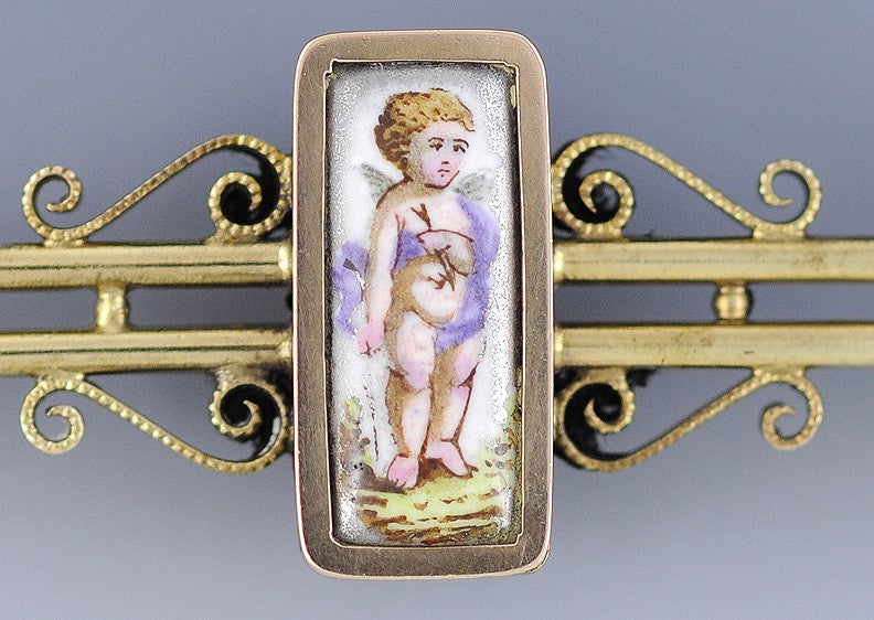 Presented is a lovely little enamel and 14 karat gold bar pin/brooch. This is a Victorian piece, dating to around the 1850s-1870s. The enamel depicts a little winged cherub or cupid holding an arrow. The picture is very nicely done, with great detail and color. The rest of the pin is decorated with scrolls and stylized shells on the ends. The pin has an old style clasp.