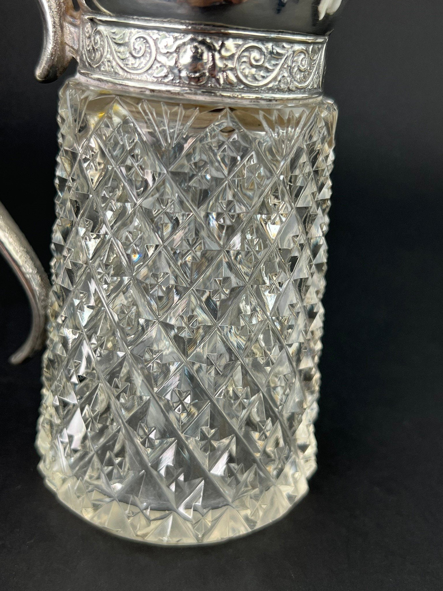 Presented is a wonderful antique American glass syrup pitcher with silverplate mounts. This piece dates to circa 1870-1900. The body is clear glass, in what I believe is the Strawberry Diamond pattern, while the collar, lid, and scroll-form handle are done in silverplate. The collar has a continuous band of foliate scrollwork design.