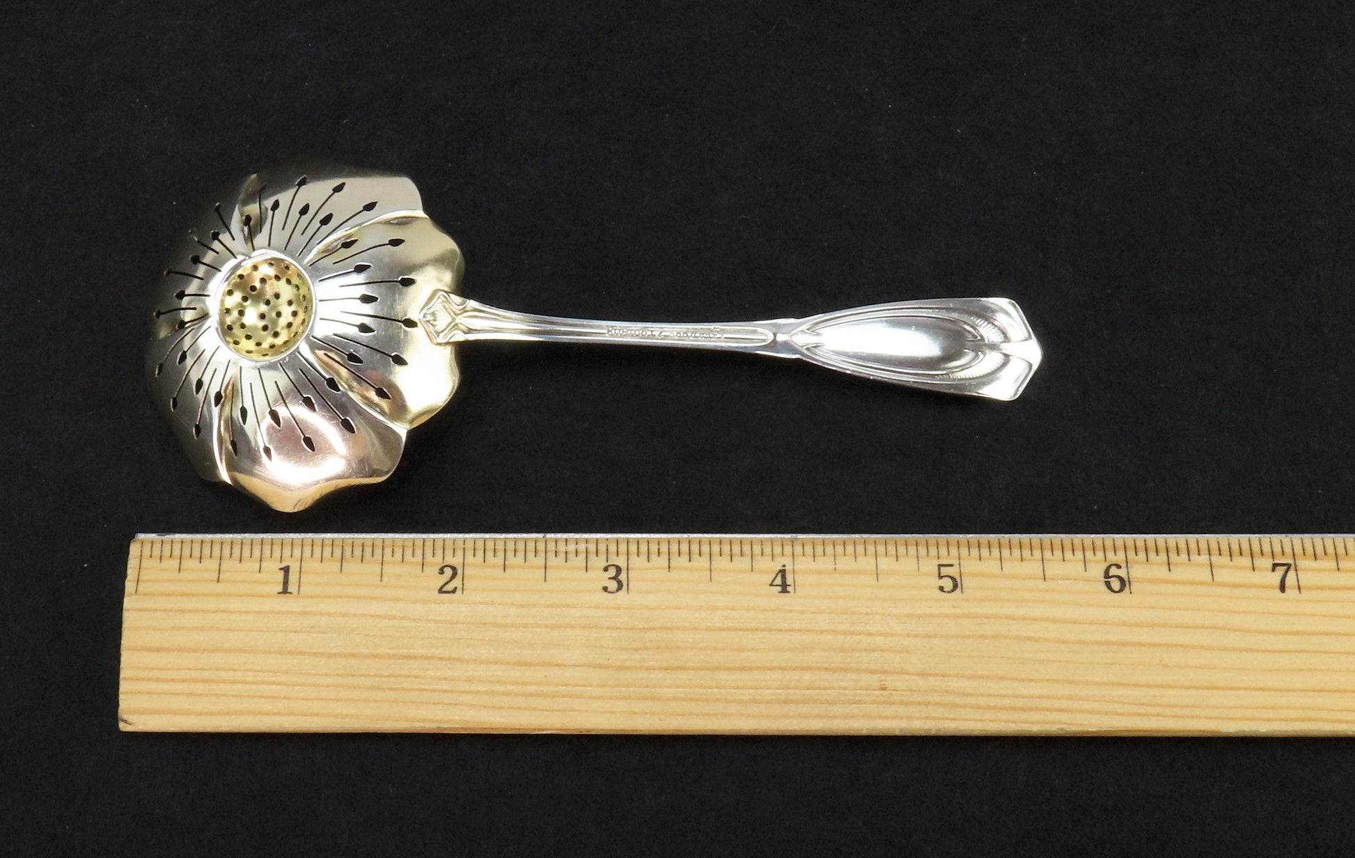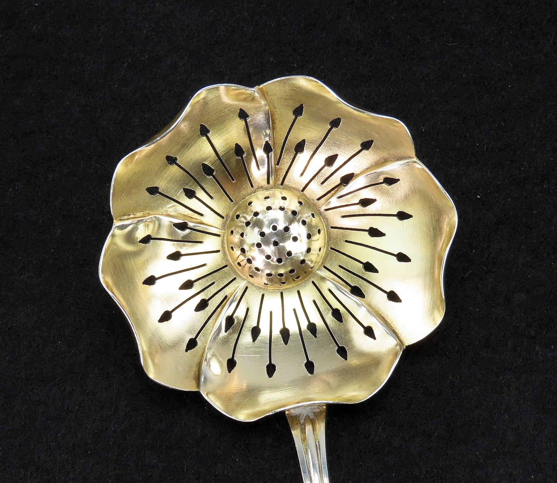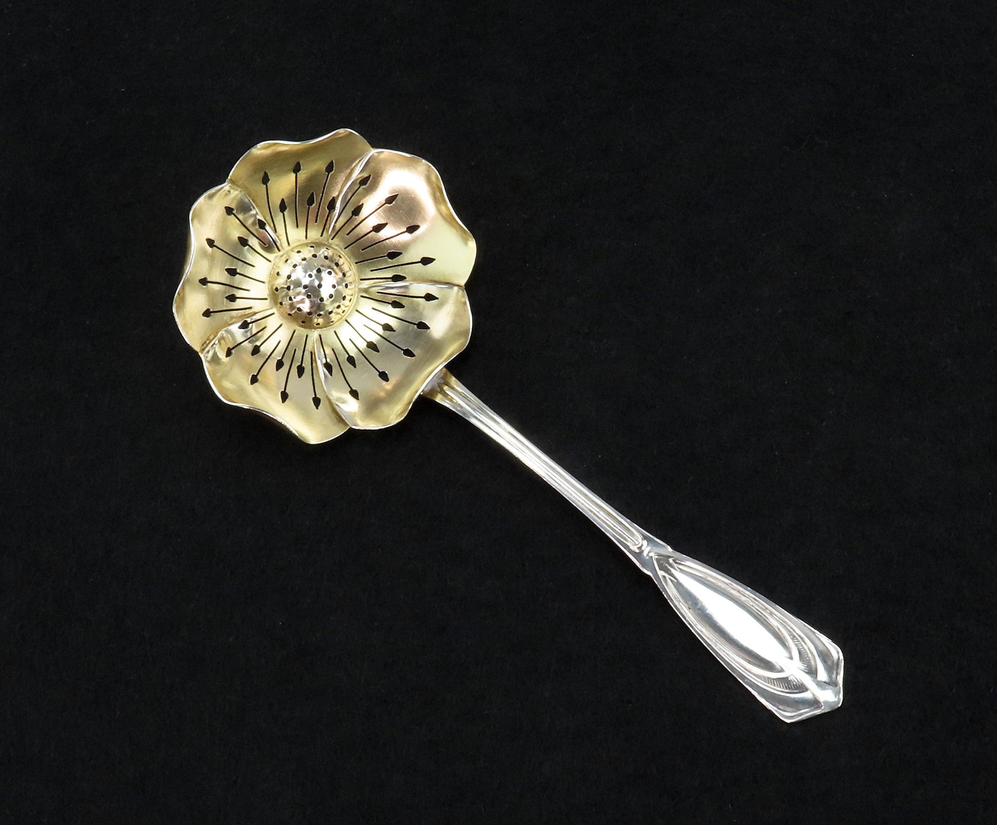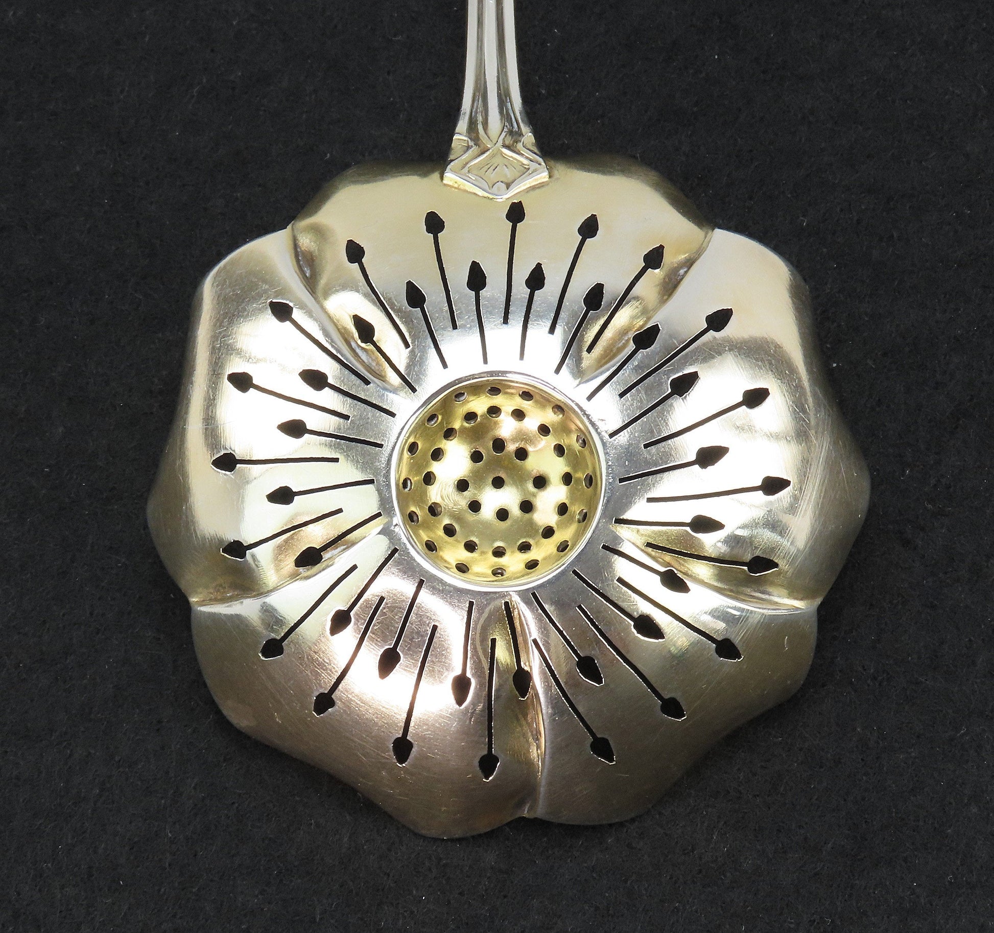 Presented is an excellent quality antique German 800 silver small pierced serving ladle or tea strainer. This piece dates to circa 1890-1910, and was made by Felix Horovitz. The bowl of the ladle is made in a beautiful flower form, with decorative pierced work around the sides and in the center and little inward flares to the tips of the petals, adding to the realism. The bowl has a gold wash, inside and out, so it could be used for a variety of serving purposes without risking pitting—great as a tea strainer or for serving berries in juice, etc. The overall look is very Art Nouveau, typical of the time to which it dates, with organic themes and flowing, sinuous lines.