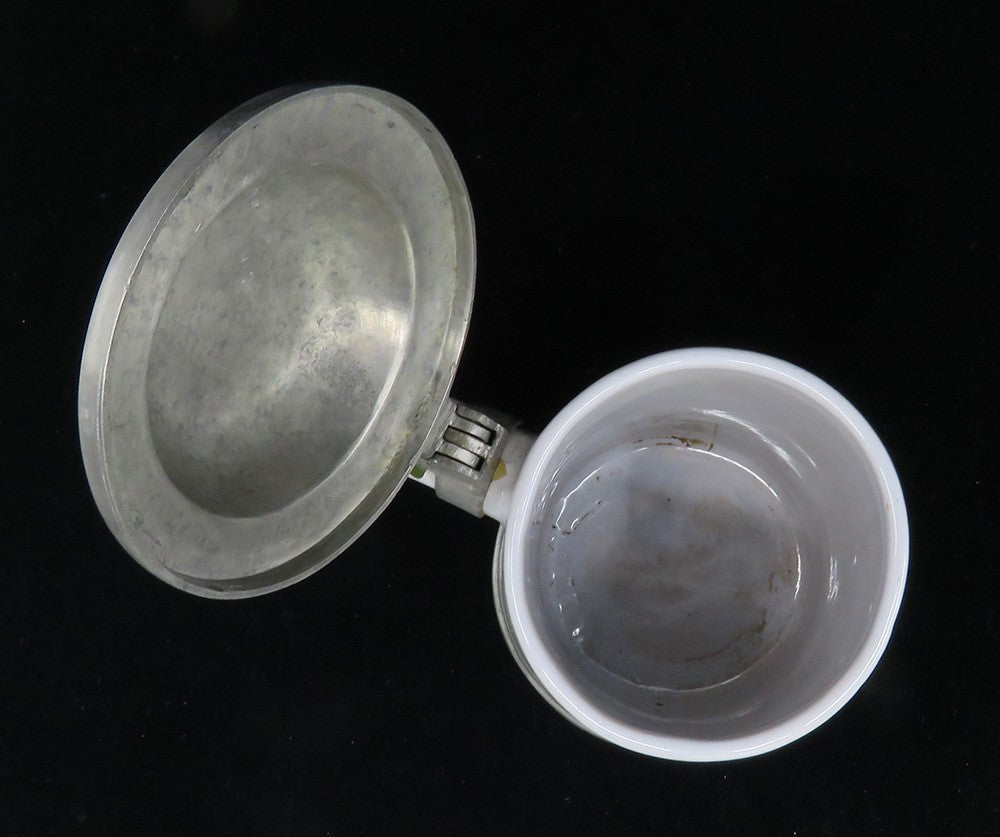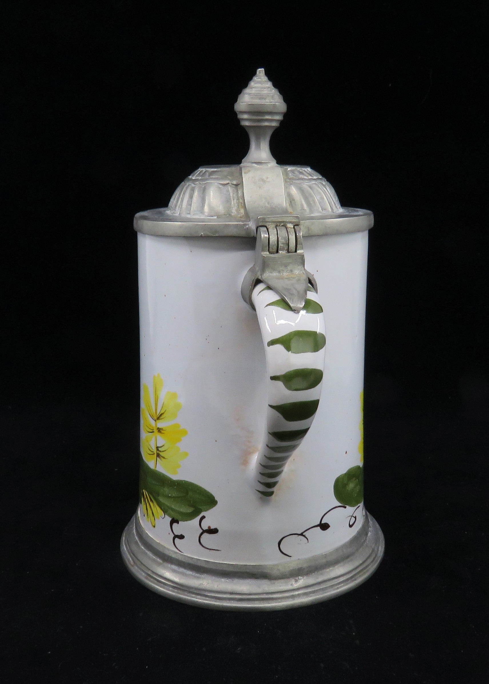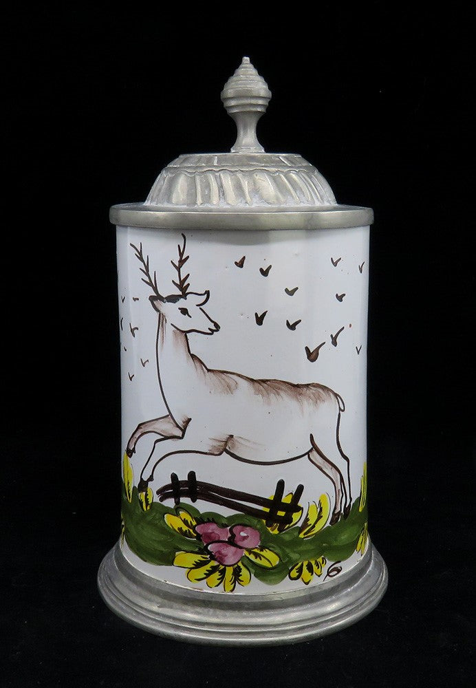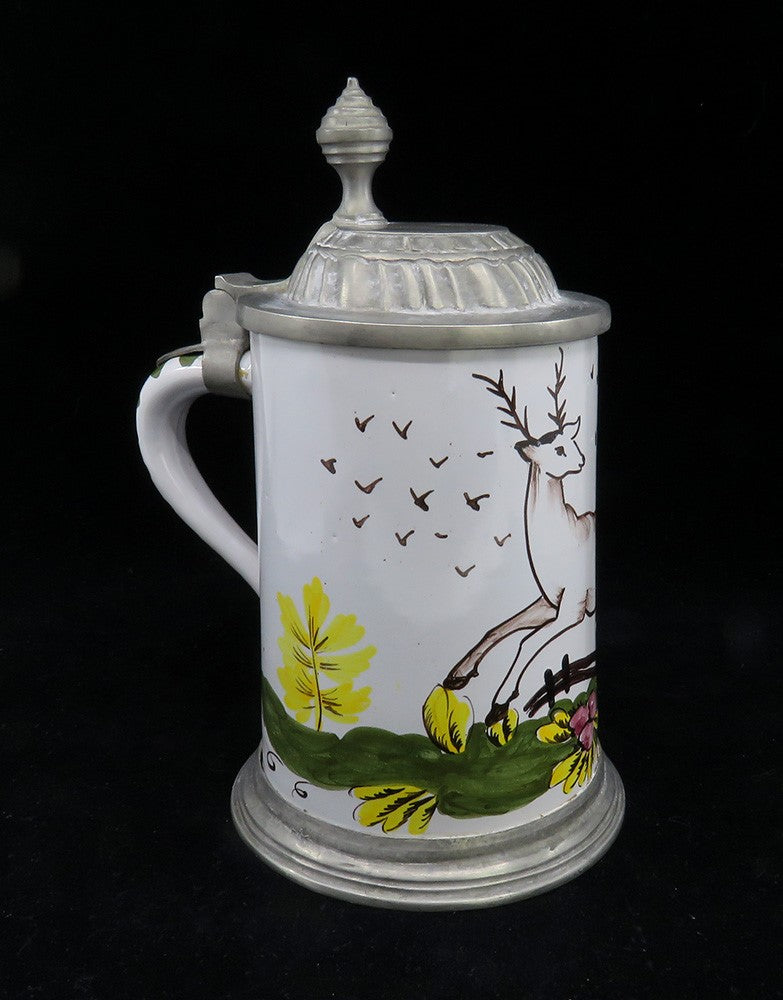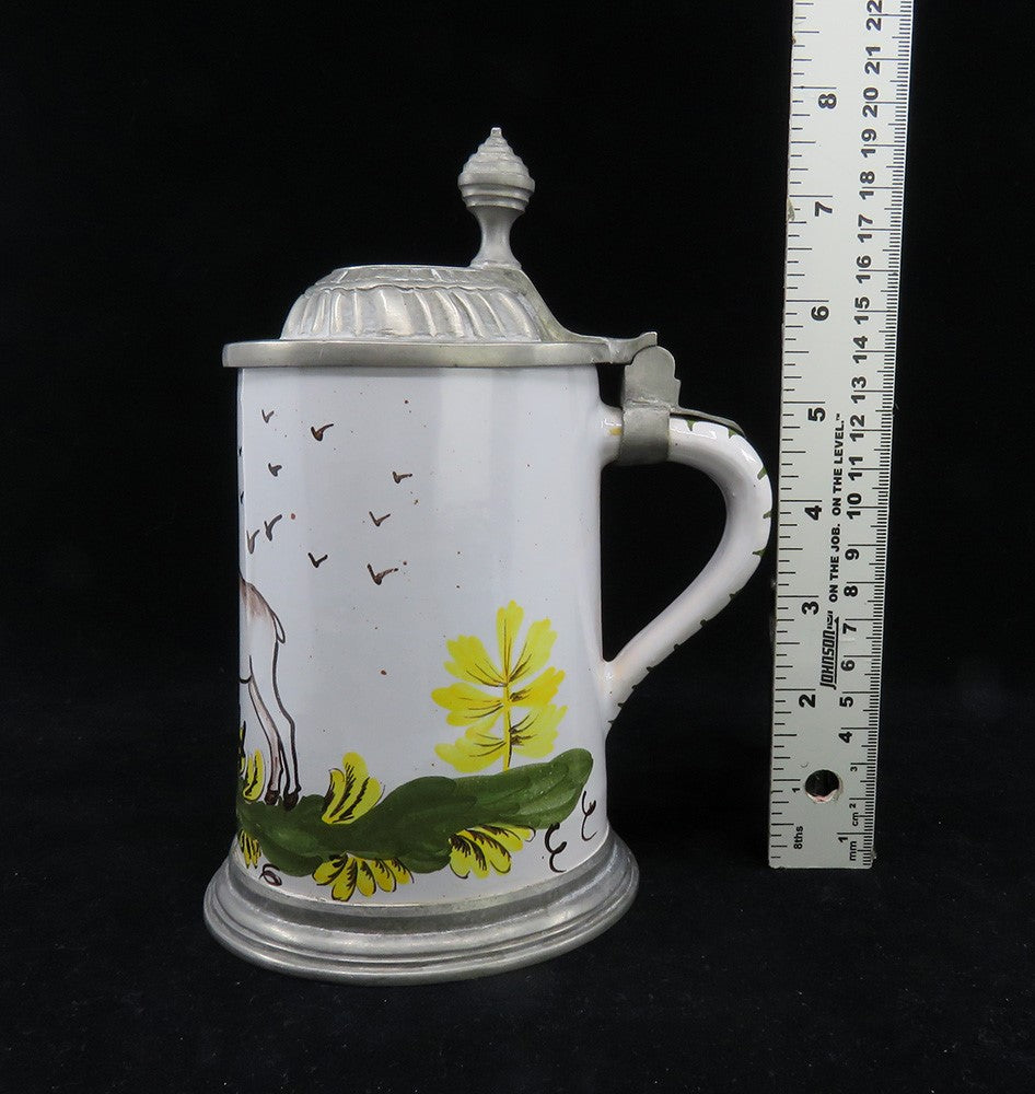 Charming mid 1800s German Faience Pottery Pewter Lid Stein w Stag Deer Design